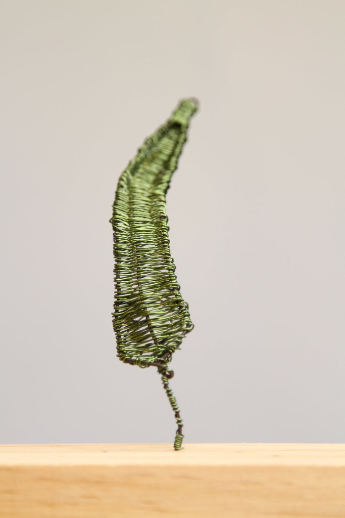 Handmade sculpture in wire, presented on a wooden base.