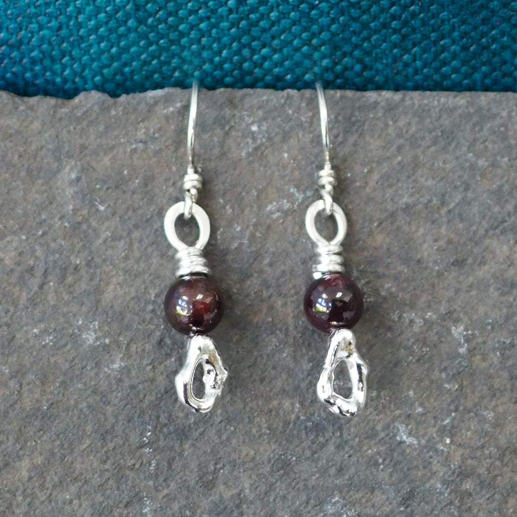 Silver dangle drop earrings created from molten silver and topped with garnet beads.
