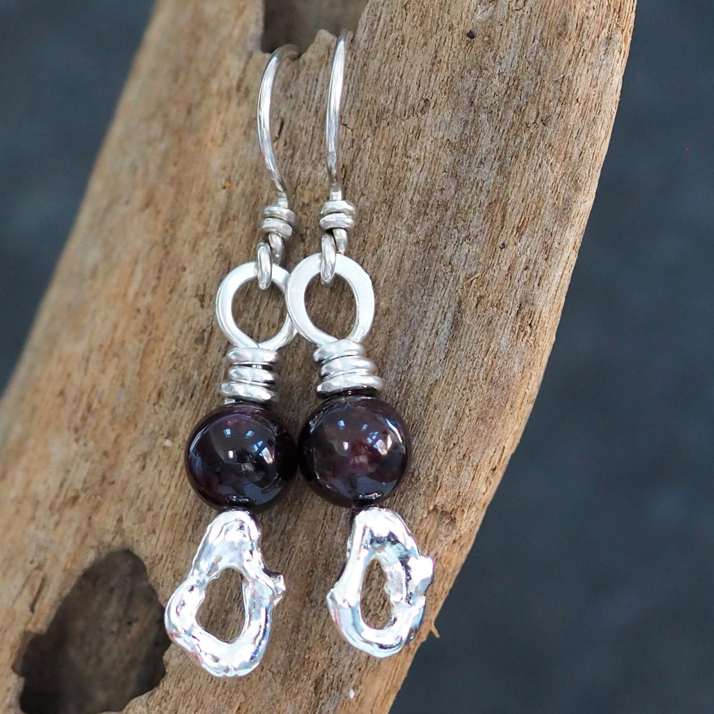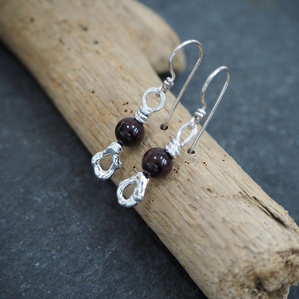 These unique one of a kind earrings are lightweight and ideal for everyday wear. The silver has been polished to a bright shine and the garnet beads are a dark red wine colour.