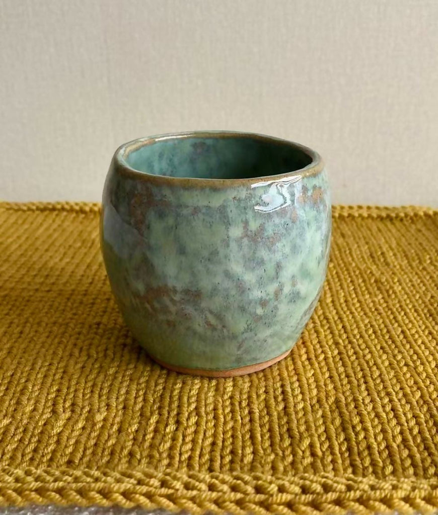 This delightful tea cup and saucer have been handmade from stoneware clay. The cup is made by hand pinching a single piece of clay and finished on the top and inside with olive glaze. It is 9cm tall and holds 200ml, although size can vary slightly as each piece is individually made. The saucer is approximately 16cm wide and made from a single rolled piece of clay. The irregular shape of the saucer is the shape it took on when rolled and is a reminder of the naturally irregular shape of a tree trunk cross section.