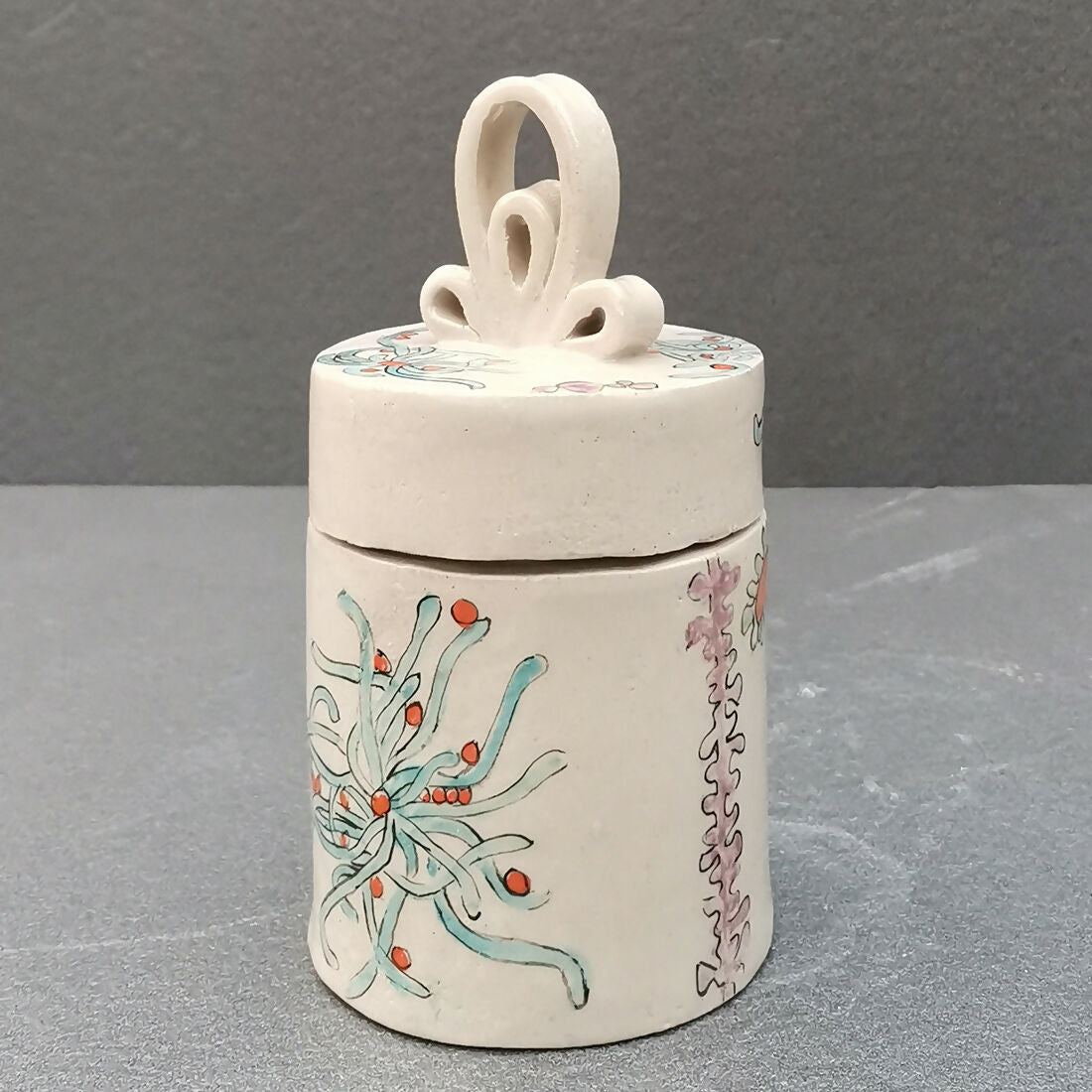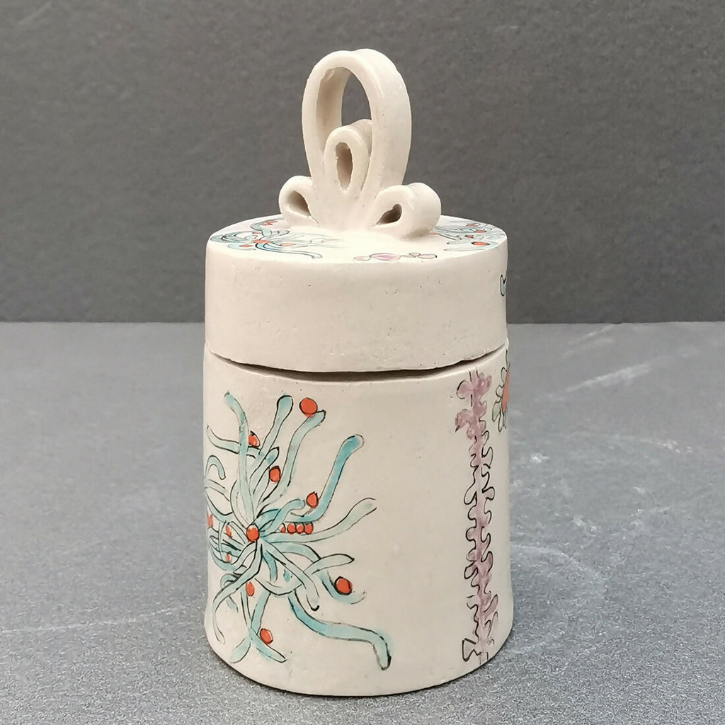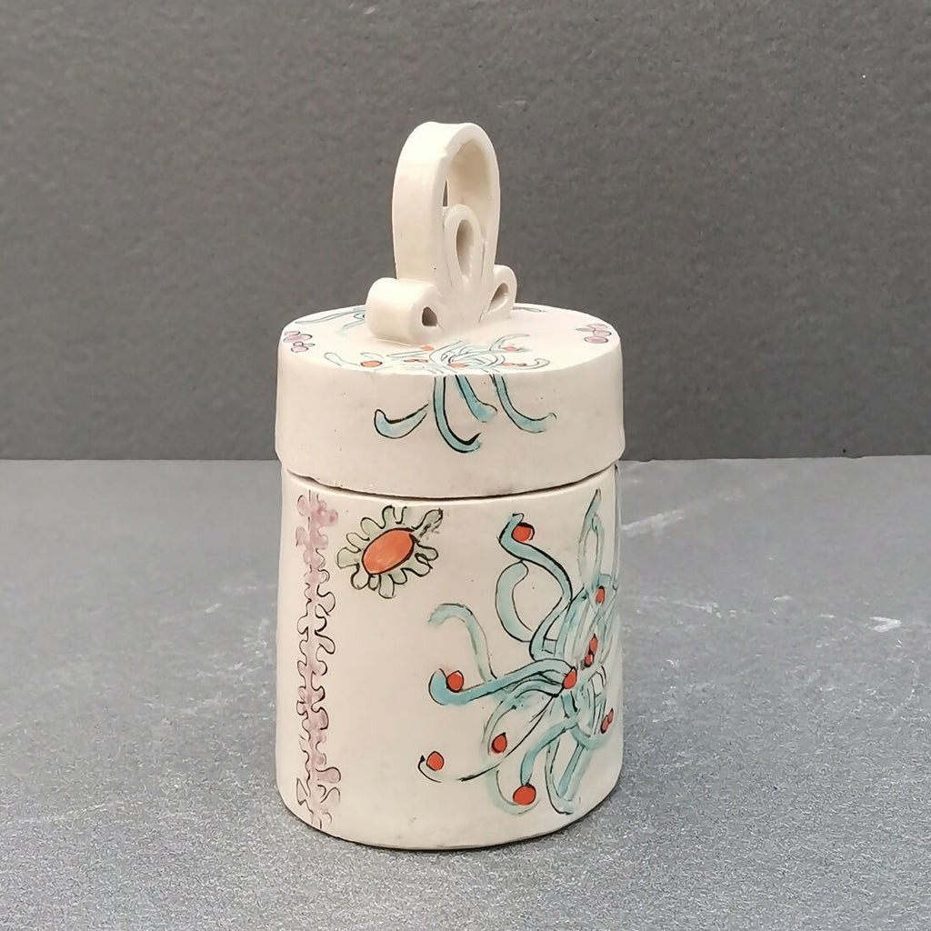 Stoneware lidded jar with hand-painted design by Kathleen Hepworth