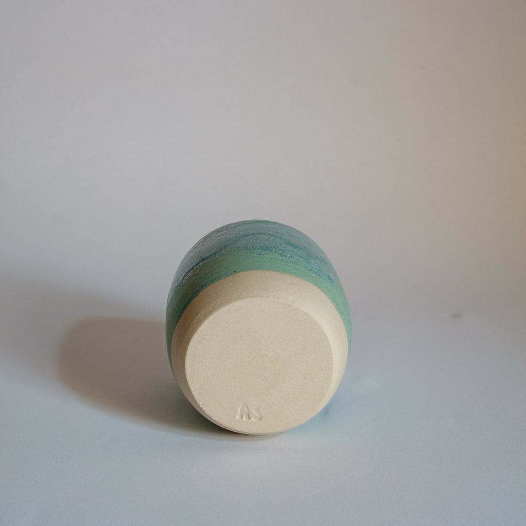Ceramic beaker/budvase, glazed in shades of matt and glossy turquoise and pale green