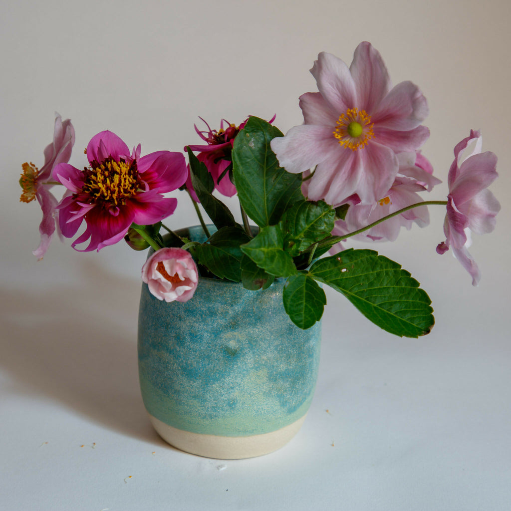 Hand thrown and fired to stoneware. A 2 cm band of unglazed stoneware at the base of the pot provides contrast to the glaze, which varies in shades of turquoise and green.