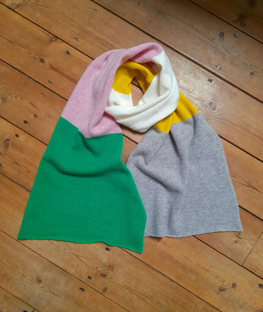 Five block stripes in the colours of green, pink, white, golden yellow and grey.