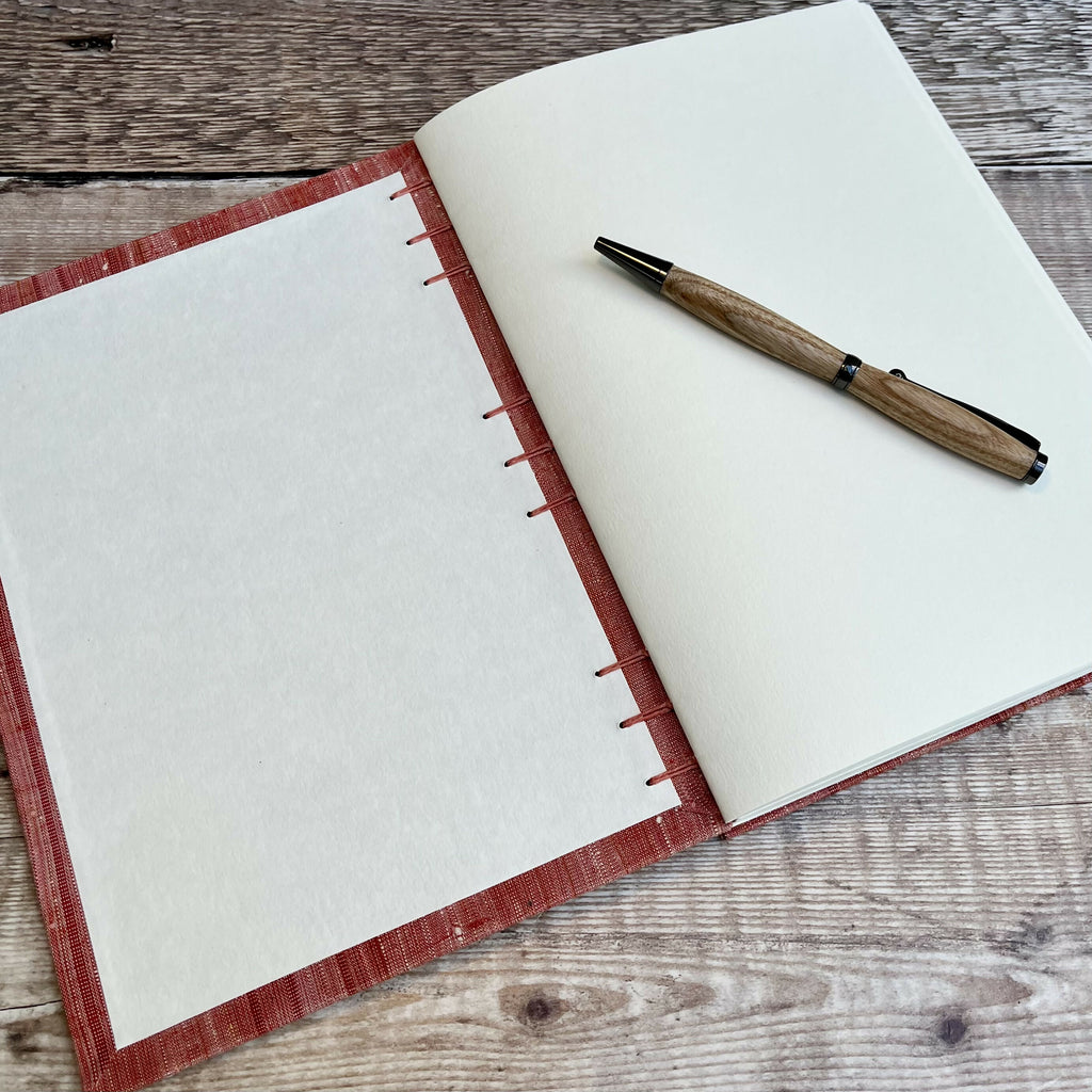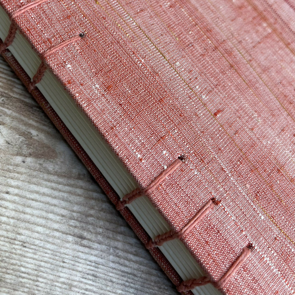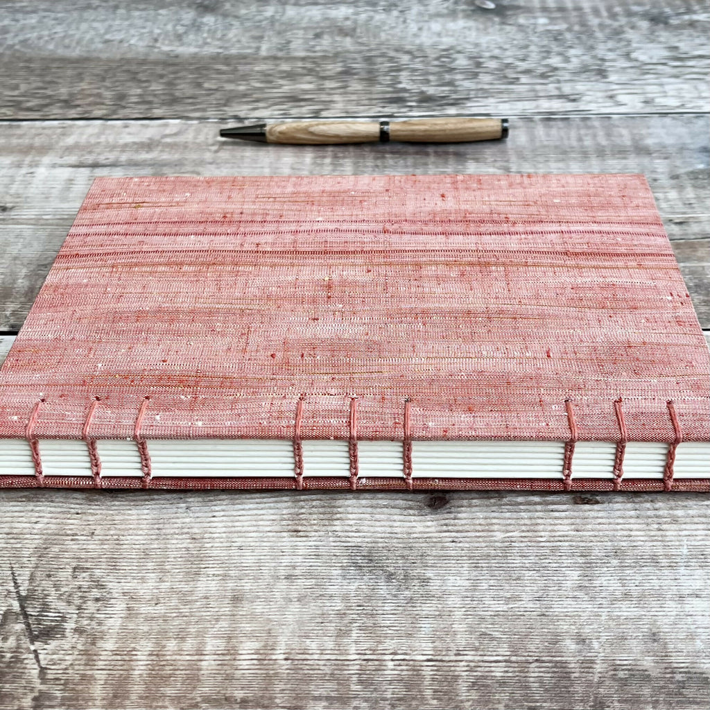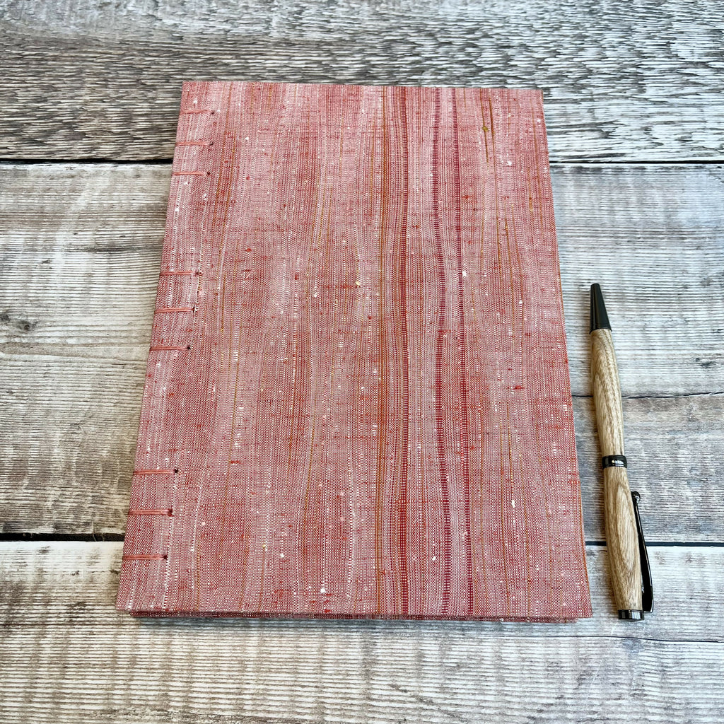 An A5 journal or sketchbook covered in a striking red upcycled kimono silk with Coptic Stitch binding.