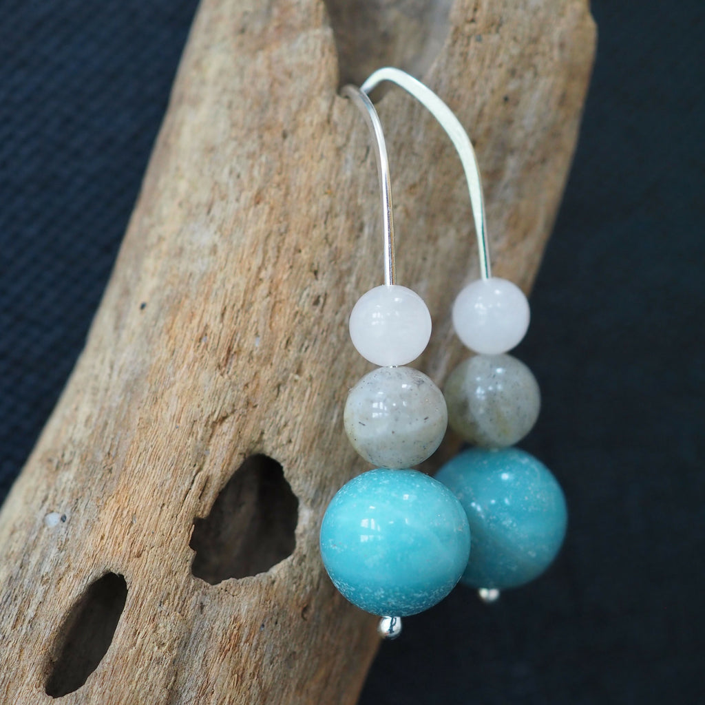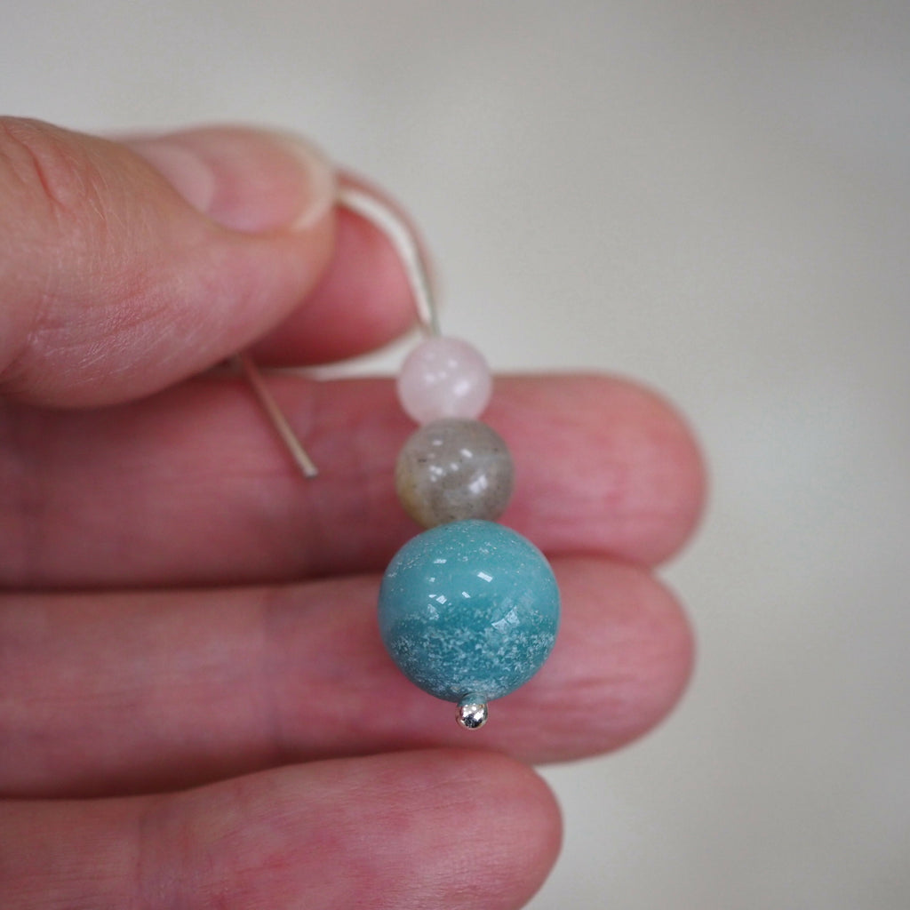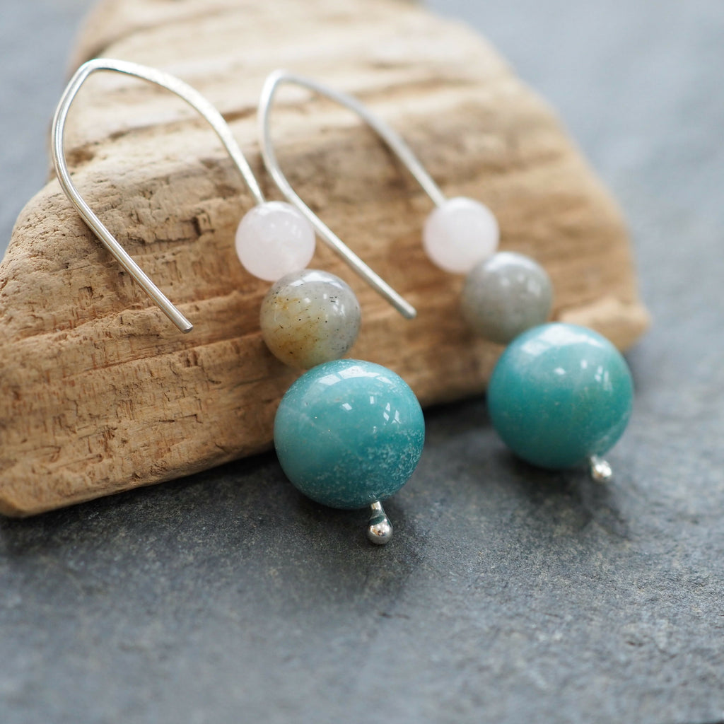 Lovely large spheres of blue amazonite have been teamed up with soft grey labradorite and pale pinky/white rose quartz beads to create these semi-precious stone drop earrings.