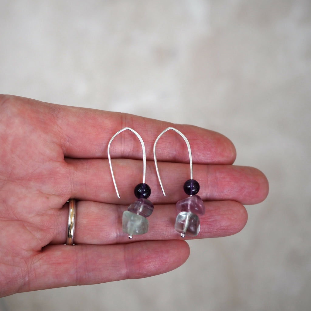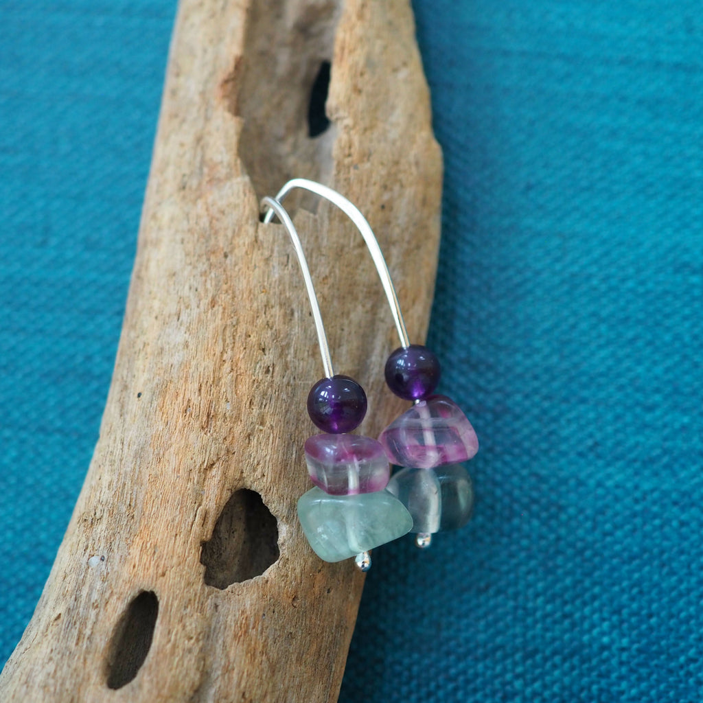 Lovely chunks of hand cut and polished fluorite have been teamed up with amethyst beads to create these simple drop earrings. The ear wire is made from Argentium silver 940 (hypoallergenic, recycled, purer than sterling, tarnish resistant). The beads range in colour from light minty green, soft mauve to deep purple.