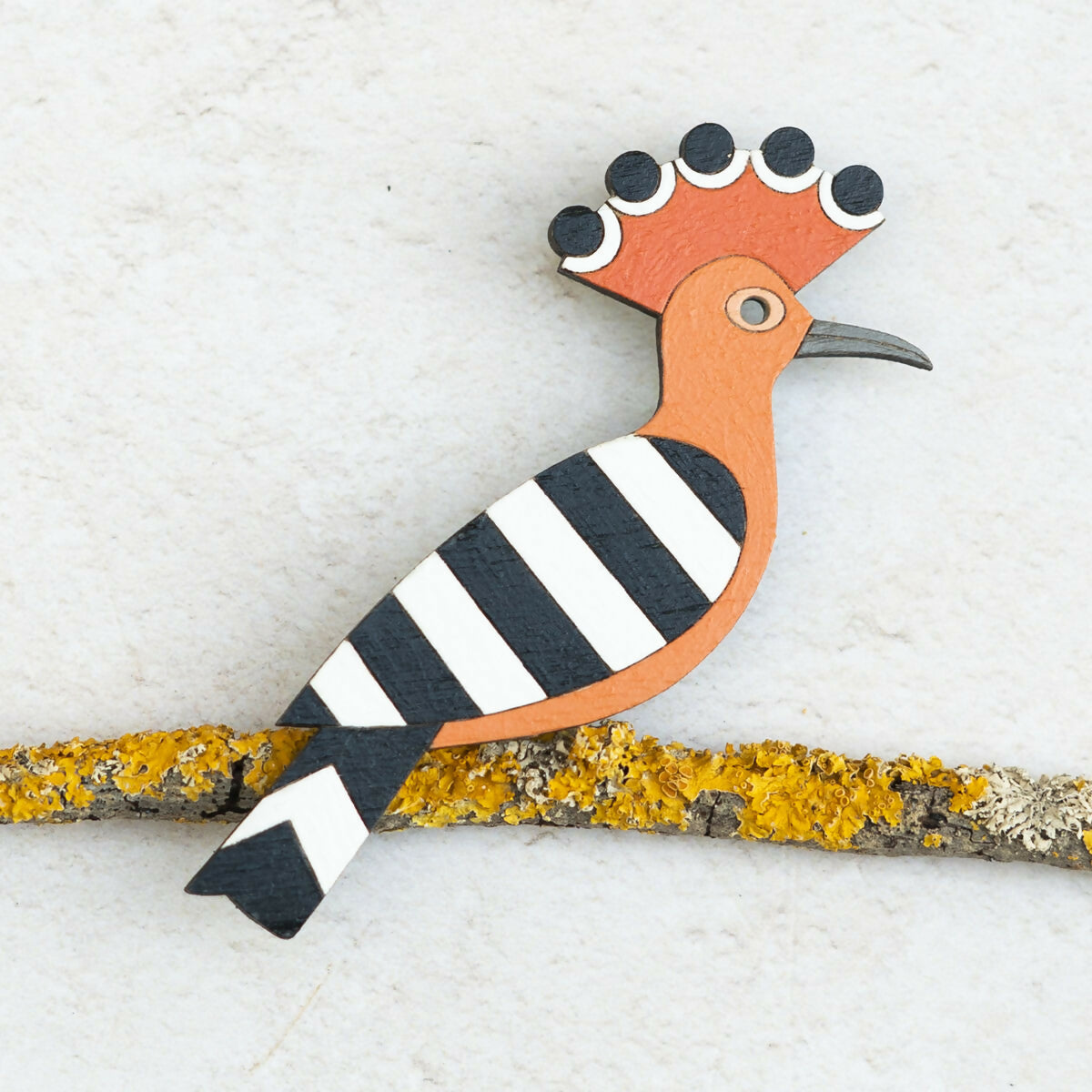 The brooch is cut from FSC certified sustainable birch and painted entirely by hand using water-based eco-friendly paint. The back of the hoopoe is painted in a dark teal and both sides are finished with a satin varnish. The brooch measures 7cm x 7cm.