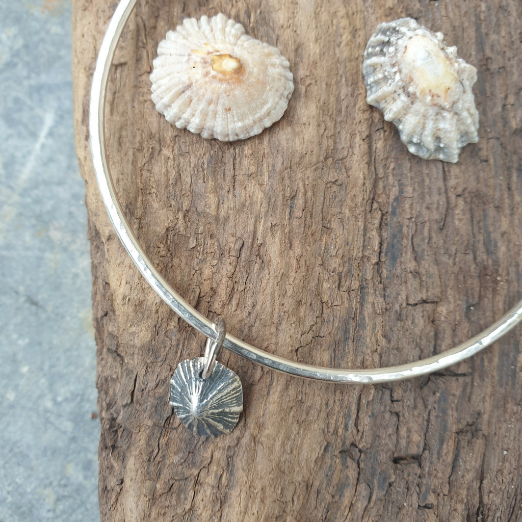 Perfect for everyday wear this bangle is made from 2mm round silver wire which has a hammered texture. A little silver limpet shell charm hangs from the bangle and the piece has been oxidised to highlight the textures.