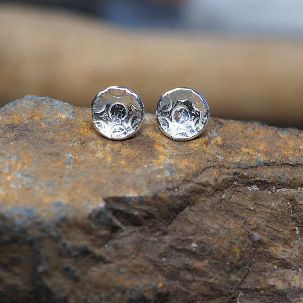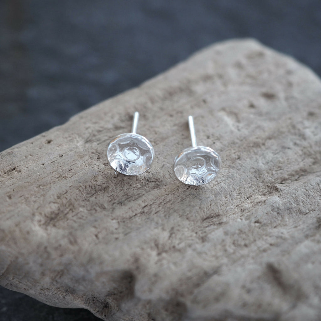 Small round silver stud earrings with texture punched into the silver. These stylish silver earrings are great for everyday wear and would make a lovely gift.