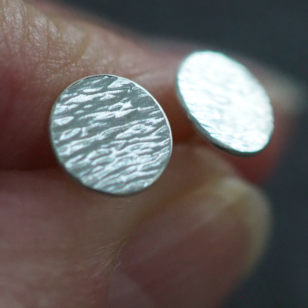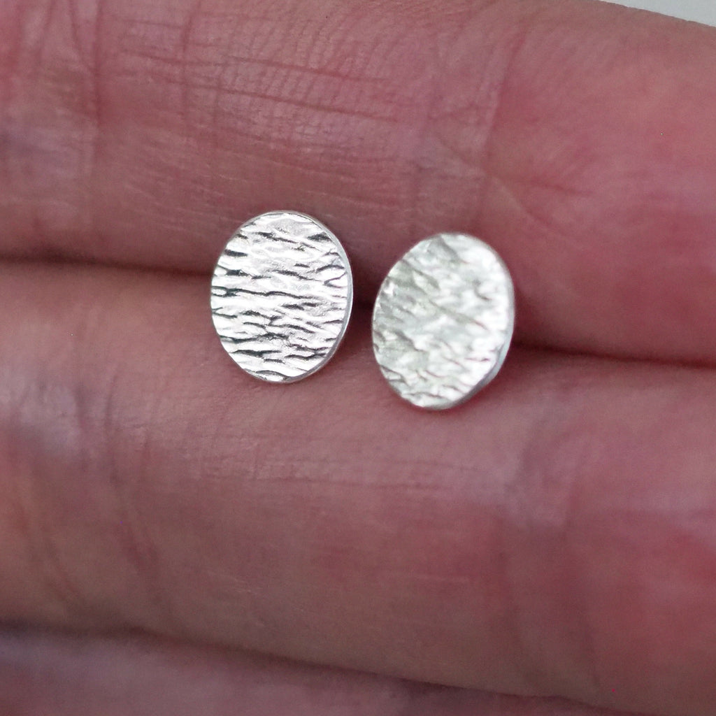 Small silver stud earrings with shimmer hammered texture. These stylish unisex silver earrings are great for everyday wear and would make a lovely gift.