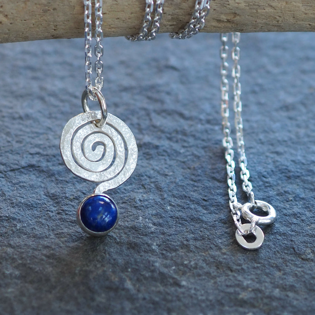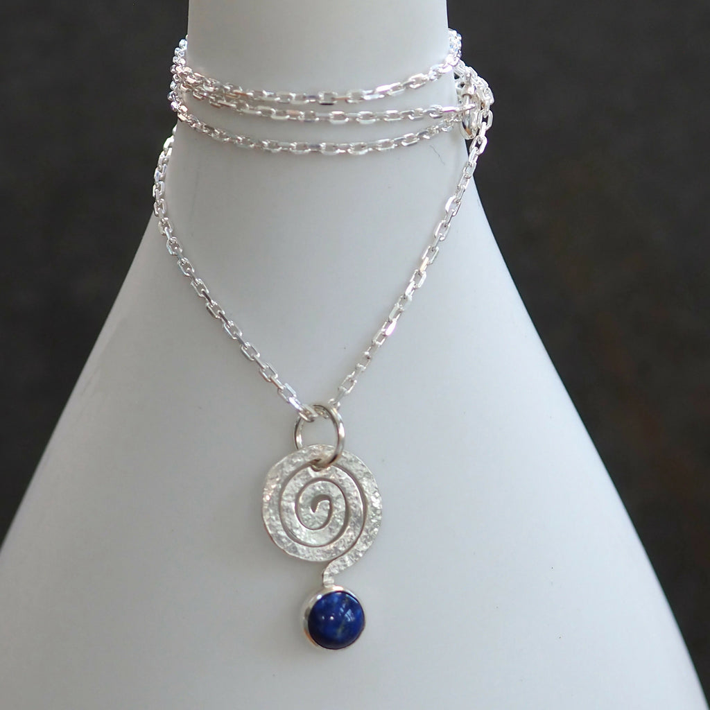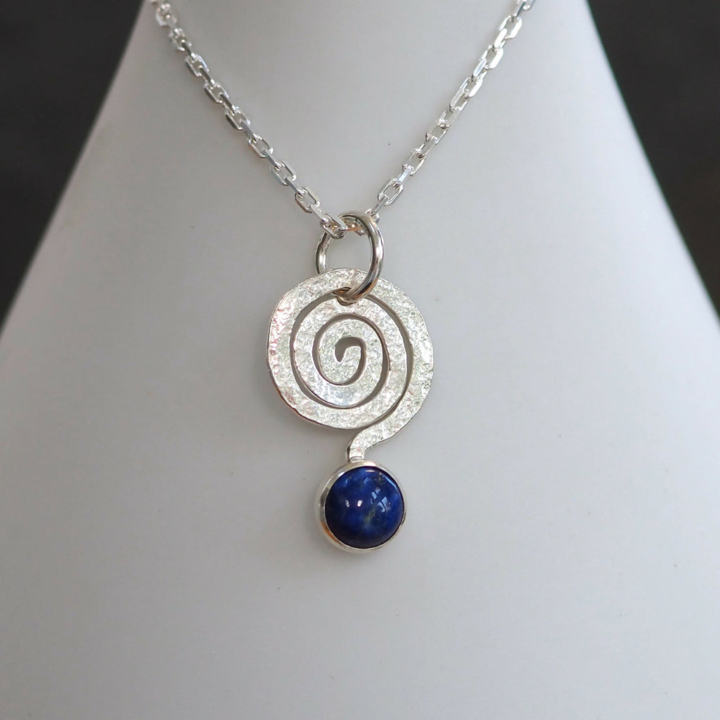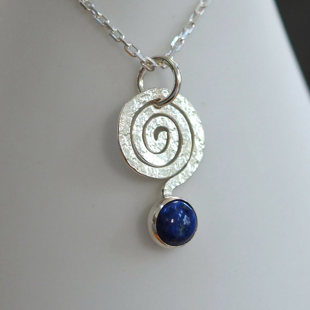 Hand crafted silver spiral pendant necklace set with a lovely deep blue lapis lazuli cabochon. The silver has been hammered with a vintage pitted hammer to add texture and sparkle. The pendant has been polished to a bright shine.