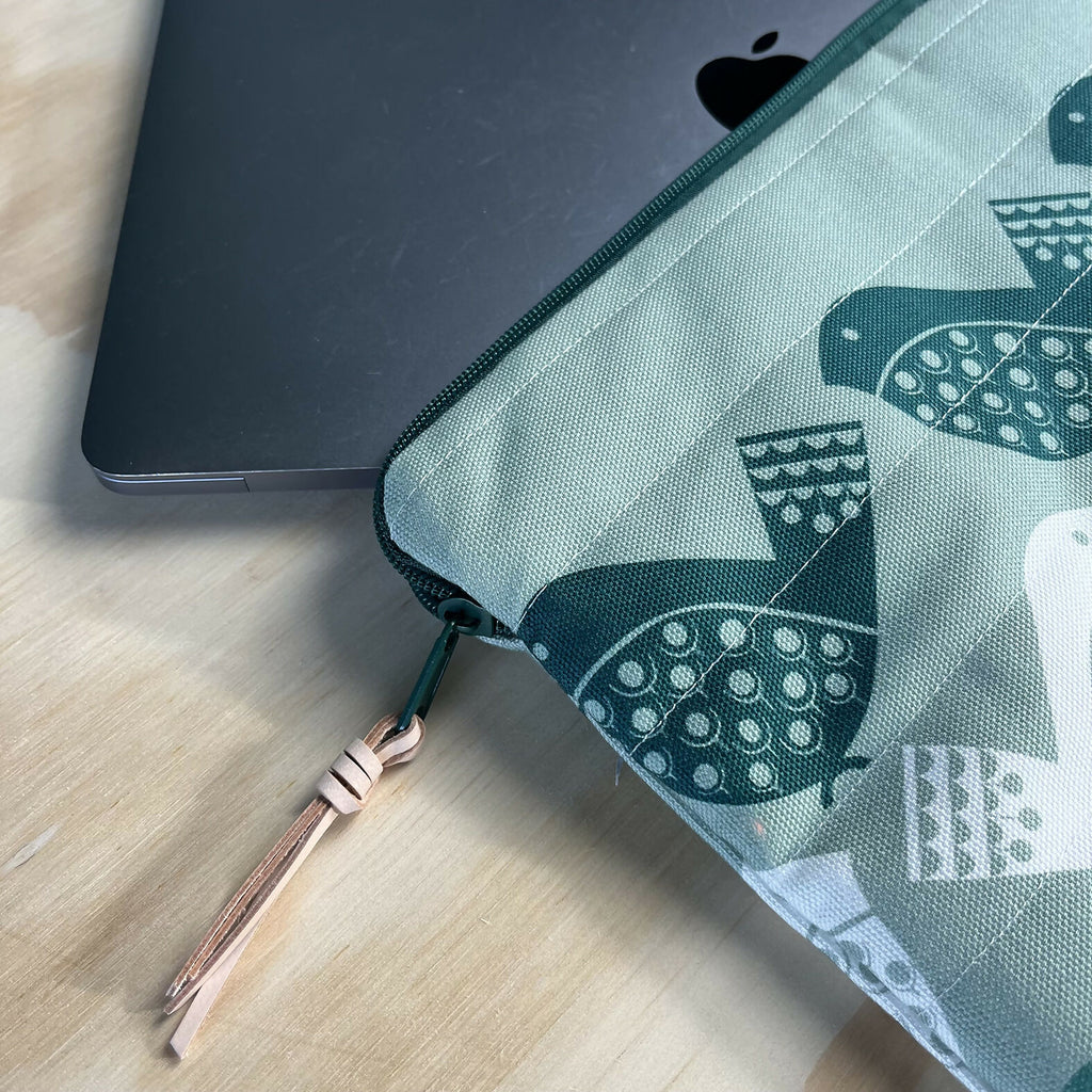 A vintage style 14” Bird design quilted Laptop case or sketchbook pouch in grey & blues with Forest green zip and navy blue lining. Great for keeping your laptop separate from the chaos of your bag or a lovely way to store in the home, this pouch is also great for A4 sketchbooks, craft projects & important documents too.