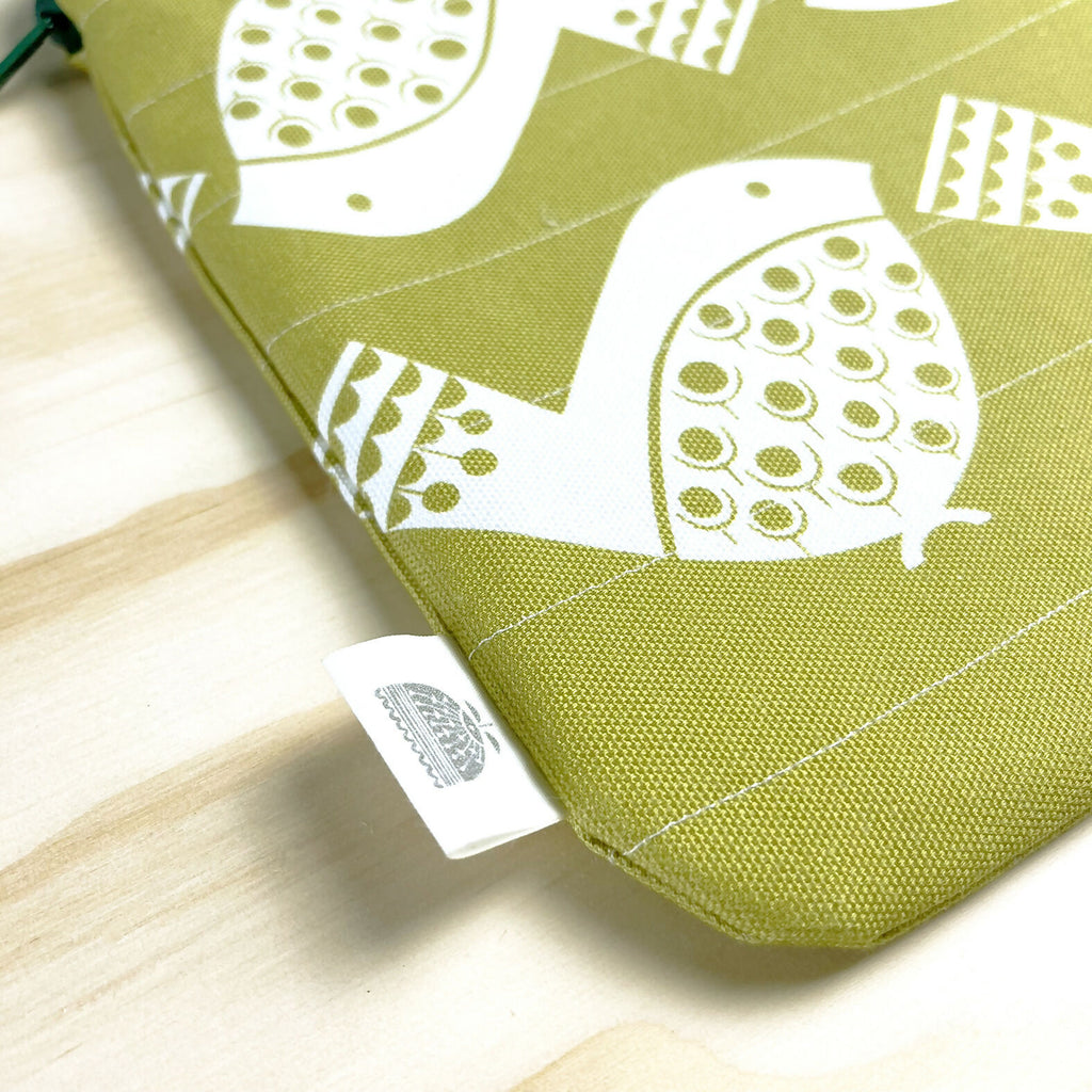 A vintage style 14” Bird design quilted Laptop case or sketchbook pouch in yellow with Forest green zip and navy blue lining. Great for keeping your laptop separate from the chaos of your bag or a lovely way to store in the home, this pouch is also great for A4 sketchbooks, craft projects & important documents too.