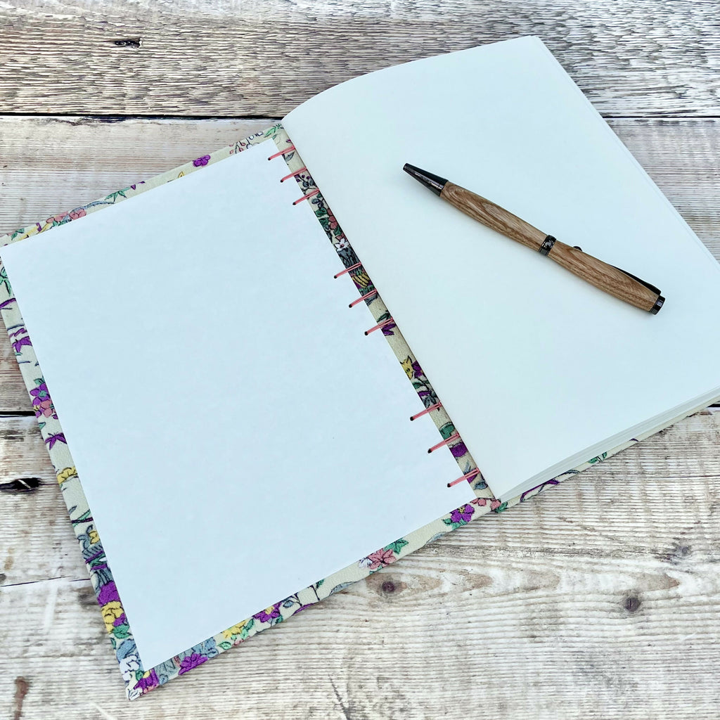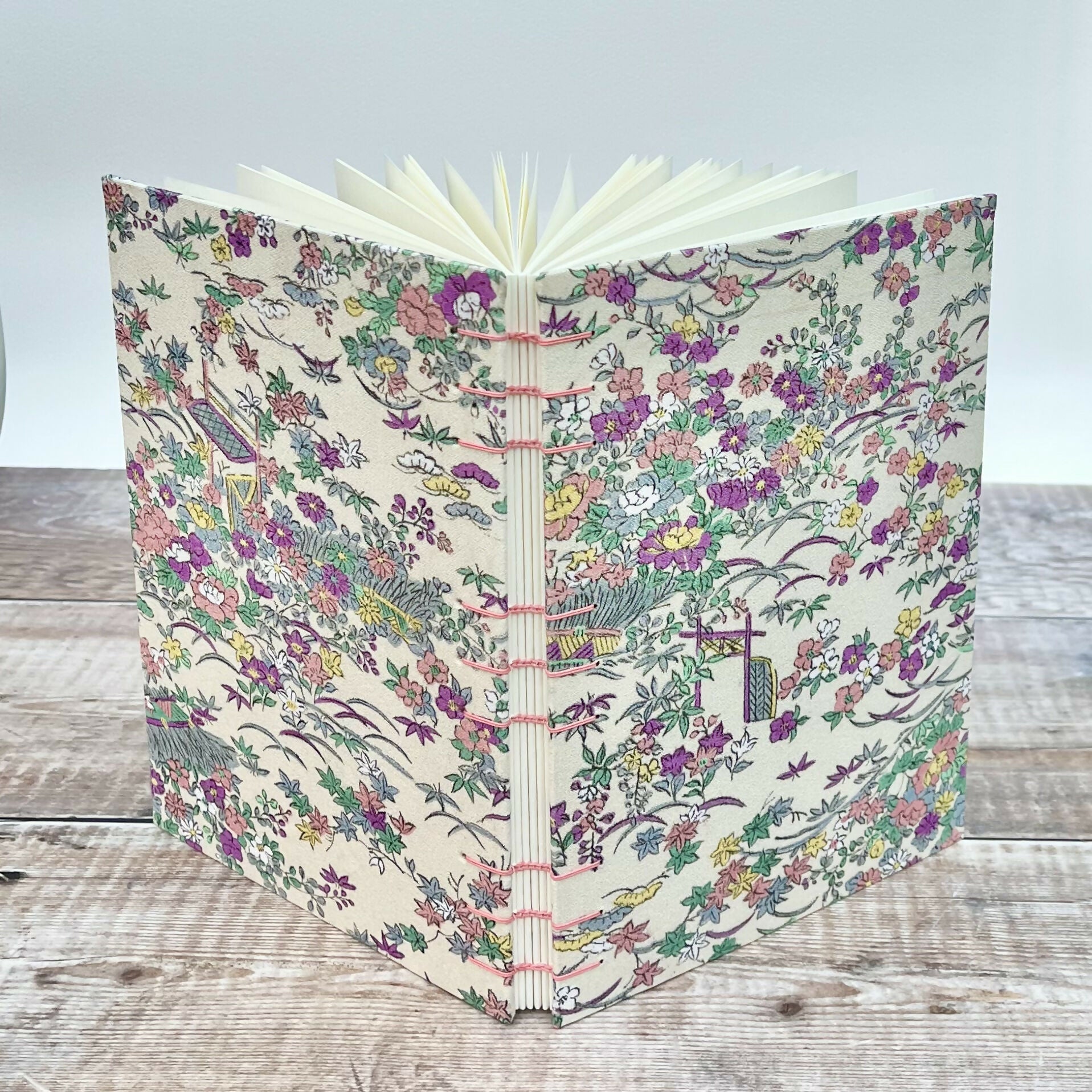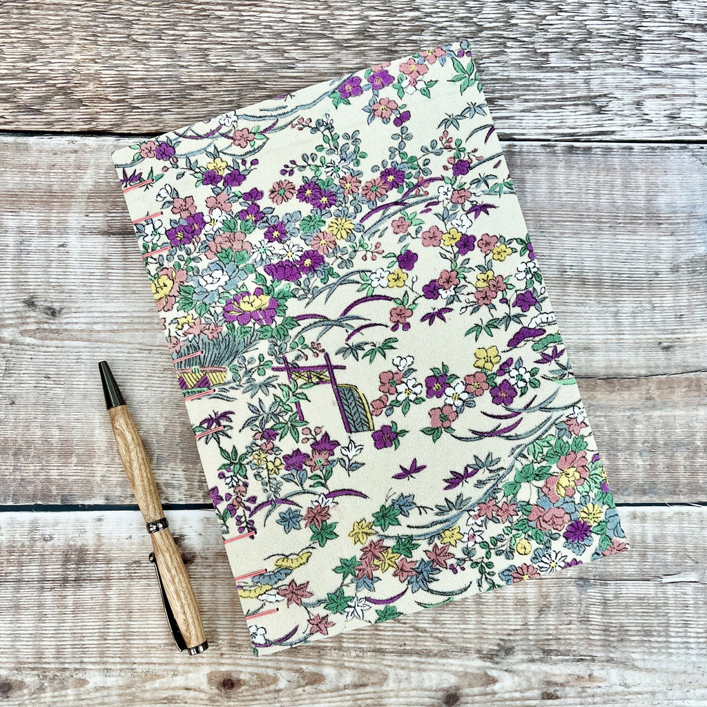 An A5 journal or sketchbook covered in a pretty, multicoloured floral up-cycled kimono silk hand bound with Coptic Stitch binding.