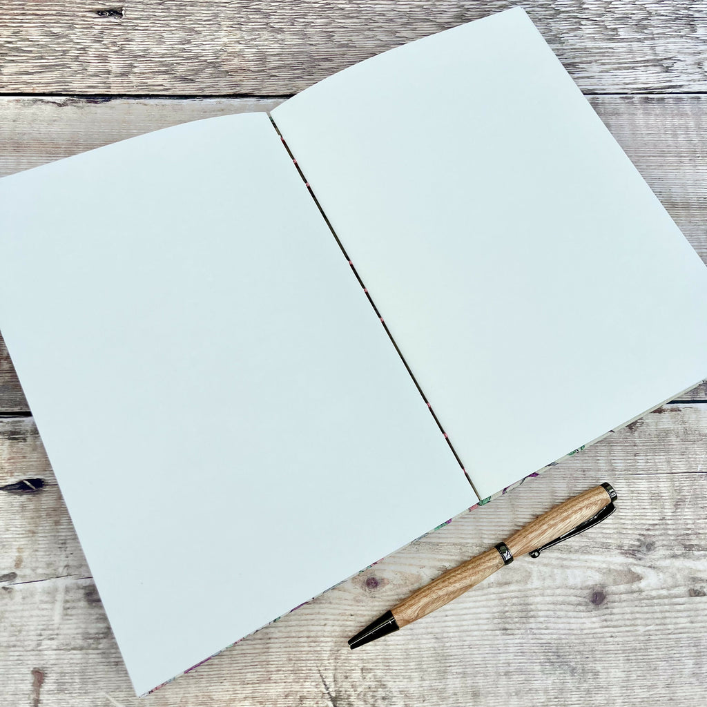 It has 56 pages (112 sides) of high quality, responsibly sourced 120gsm pale ivory paper, perfect for all writing and drawing mediums. The paper is folded into 7 sections which are then stitched together to create a beautiful exposed spine binding, allowing the book to lay completely flat when open.