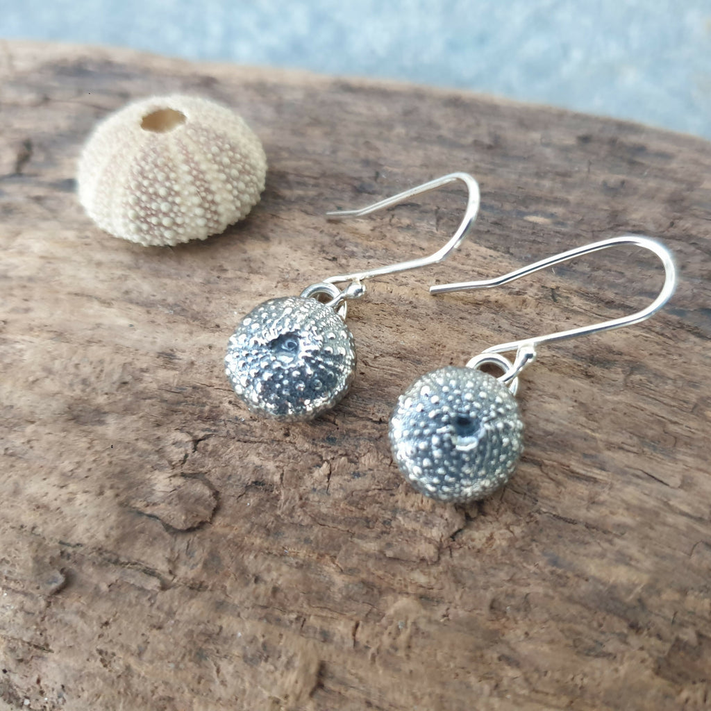 Made from a mould of a real little sea urchin these little dangly earrings are handmade with fine silver clay which is then torch fired and oxidised to bring out the textures. A perfect gift for anyone who loves the sea.