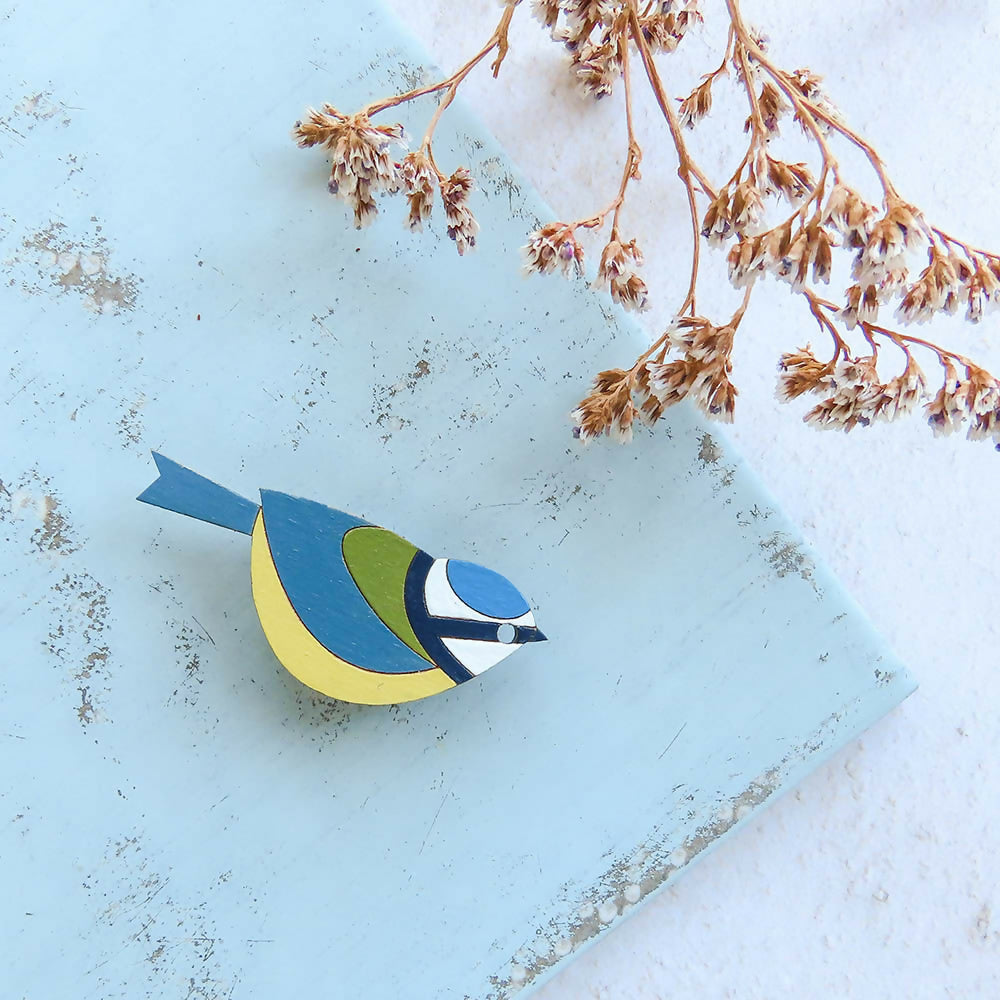 The charming little blue tit is the inspiration for this brooch design. It is cut from FSC certified sustainable birch and painted entirely by hand using eco-friendly Farrow and Ball colours. The back of the brooch is painted a mustard yellow and both sides are finished with a satin varnish. The brooch measures 5cm x 2cm.