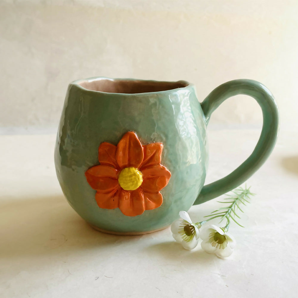 This delightful green cup with orange marigold has been made by hand using coil and pinch techniques. The impressions left from this hand making process add texture to the hand glazed finish. The inside of the cup has been clear glazed.