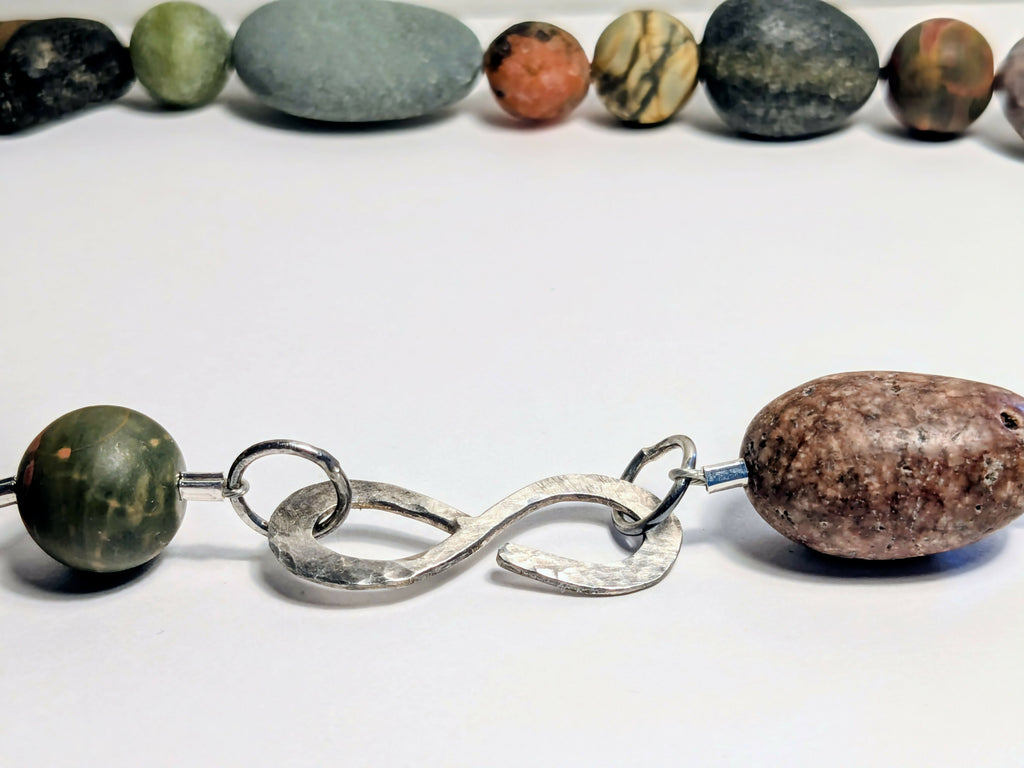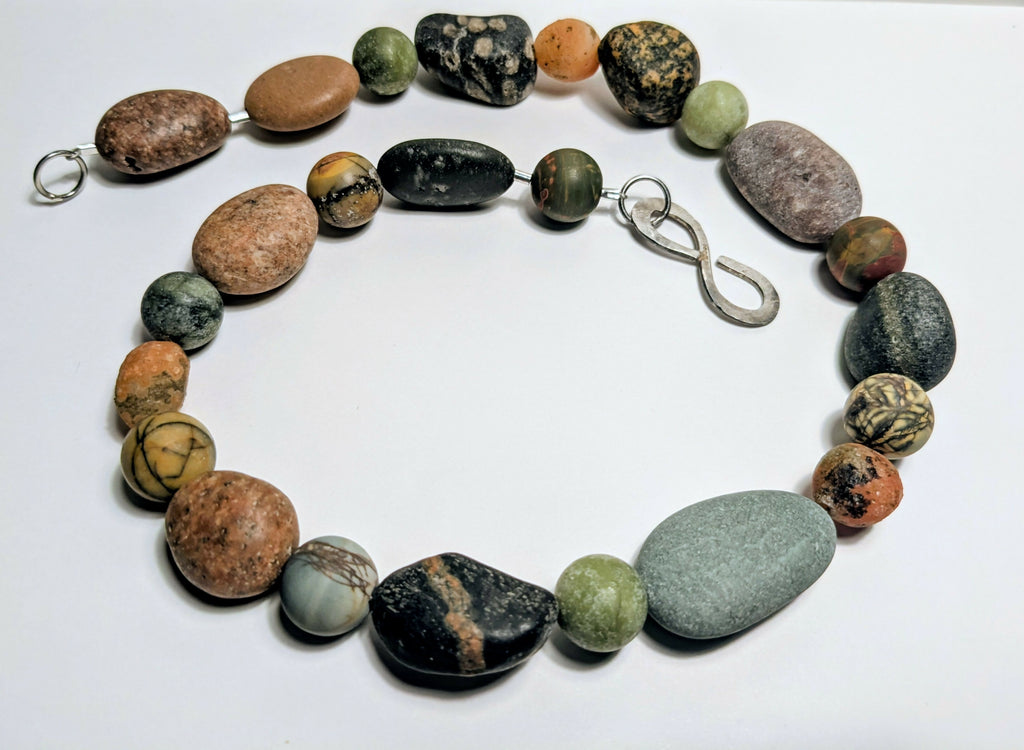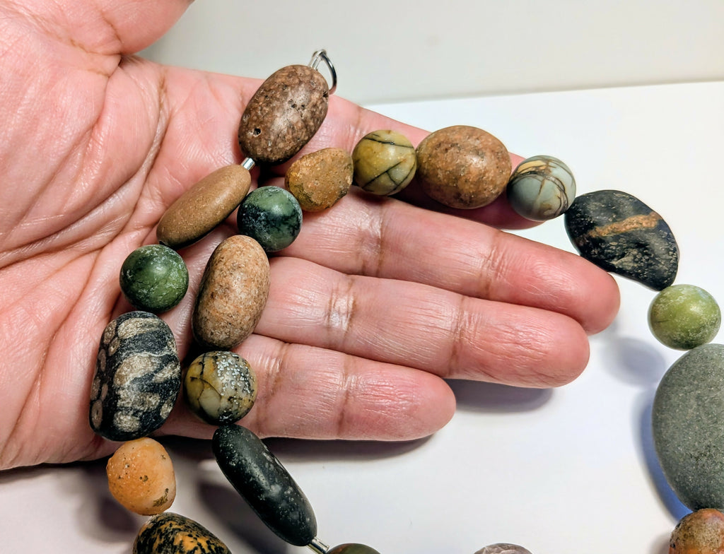 Necklace made with Scottish Beach Stones, Fossil Coral, Red Cherry Creek Jasper, Green Opal & Orange Agate Geodes.