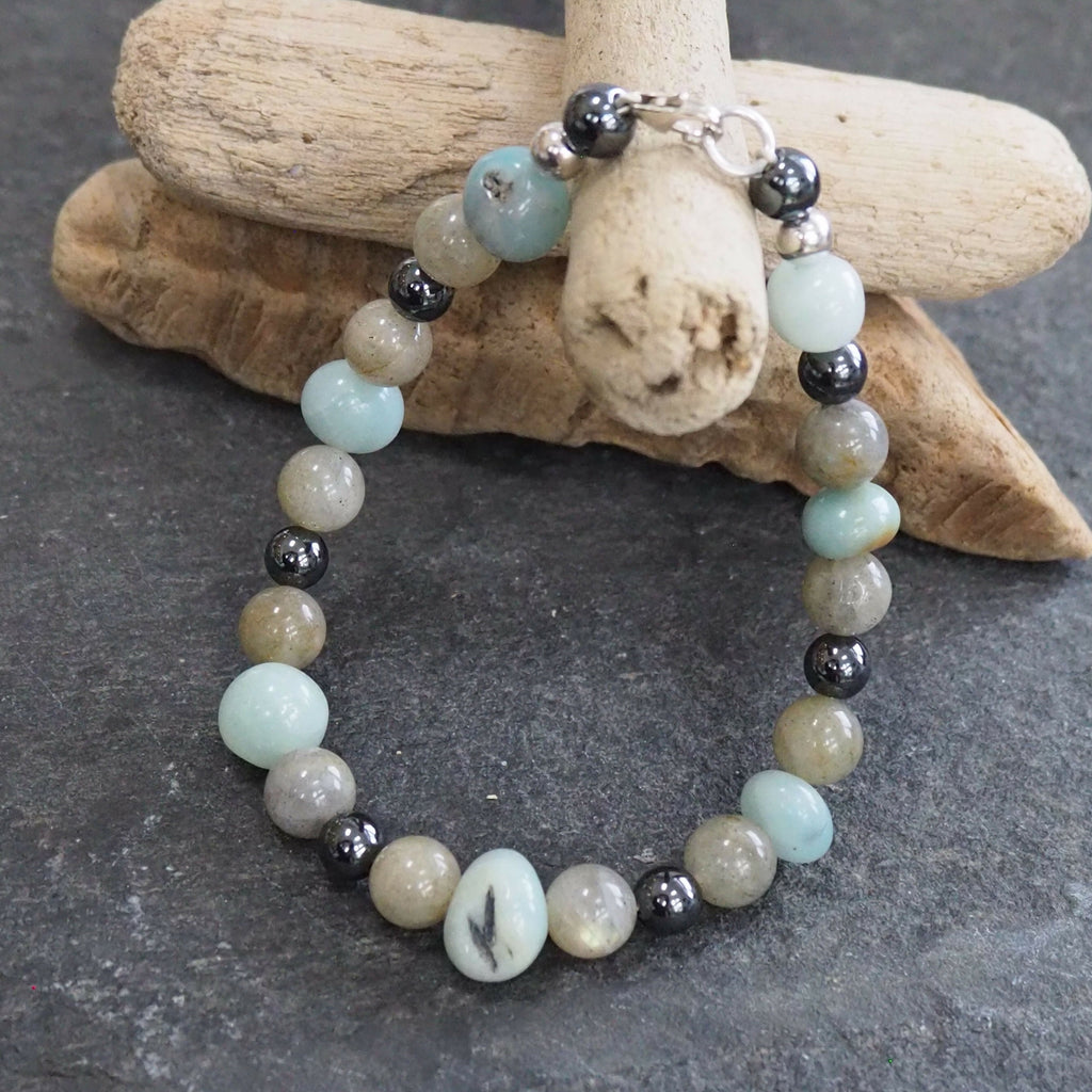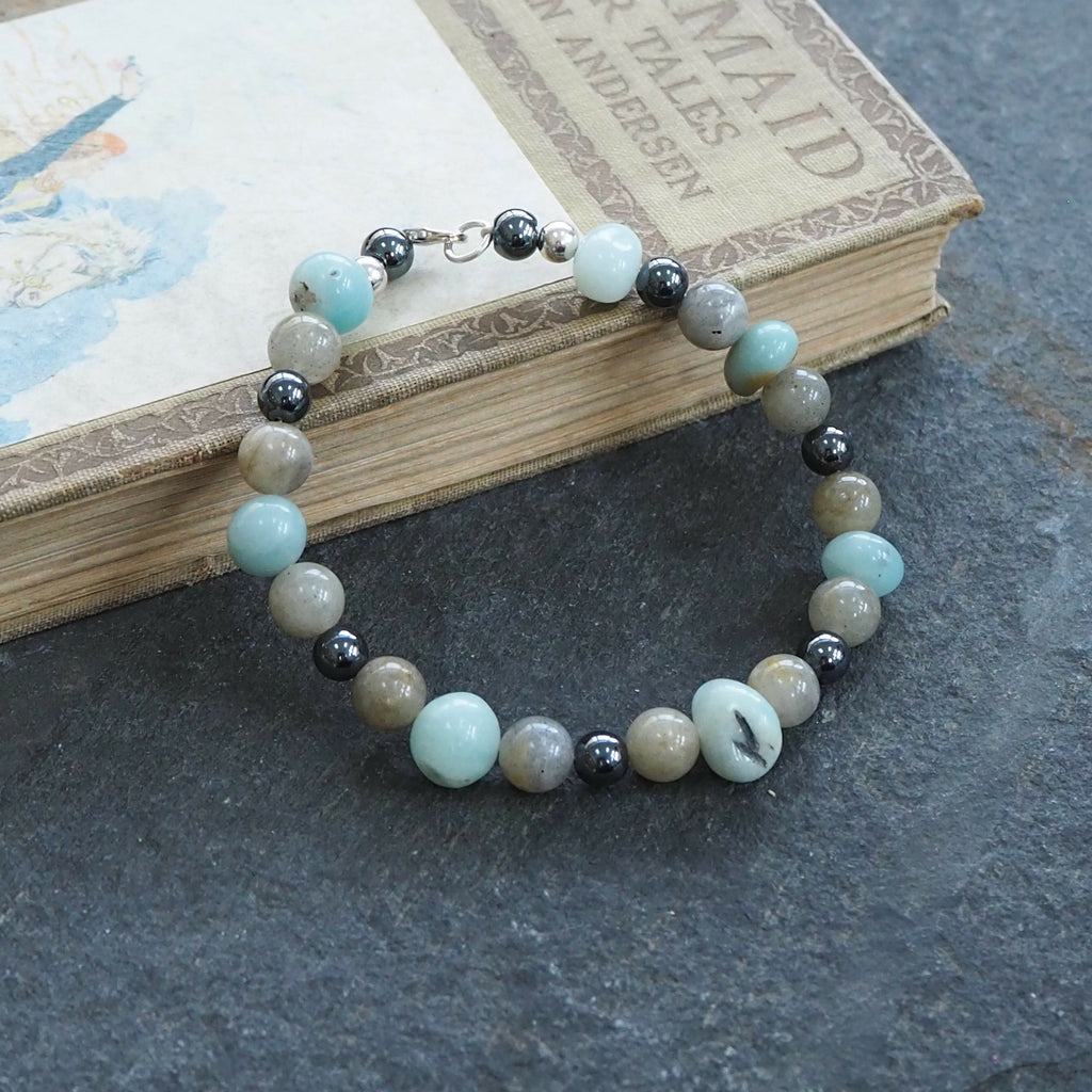 This handmade semi-precious stone bead bracelet features a selection of amazonite, labradorite, hematite and silver beads, in shades of smokey grey, duck egg blue, glossy charcoal and silver.