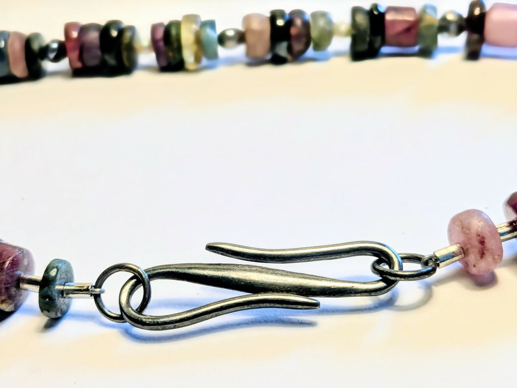 This necklace is made using Tourmaline gemstone beads & Pearls (both Ivory & Peacock varieties). The Tourmalines are a range of different colours & textures. It is a mix of matt & polished stones which gives it an ancient look.