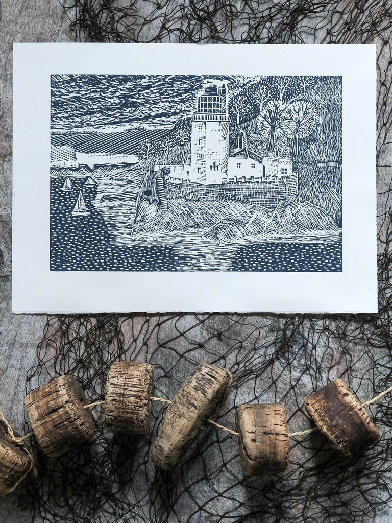 Limited edition lino print, inspired by the beautiful St Anthony's Lighthouse in Roseland, Cornwall.