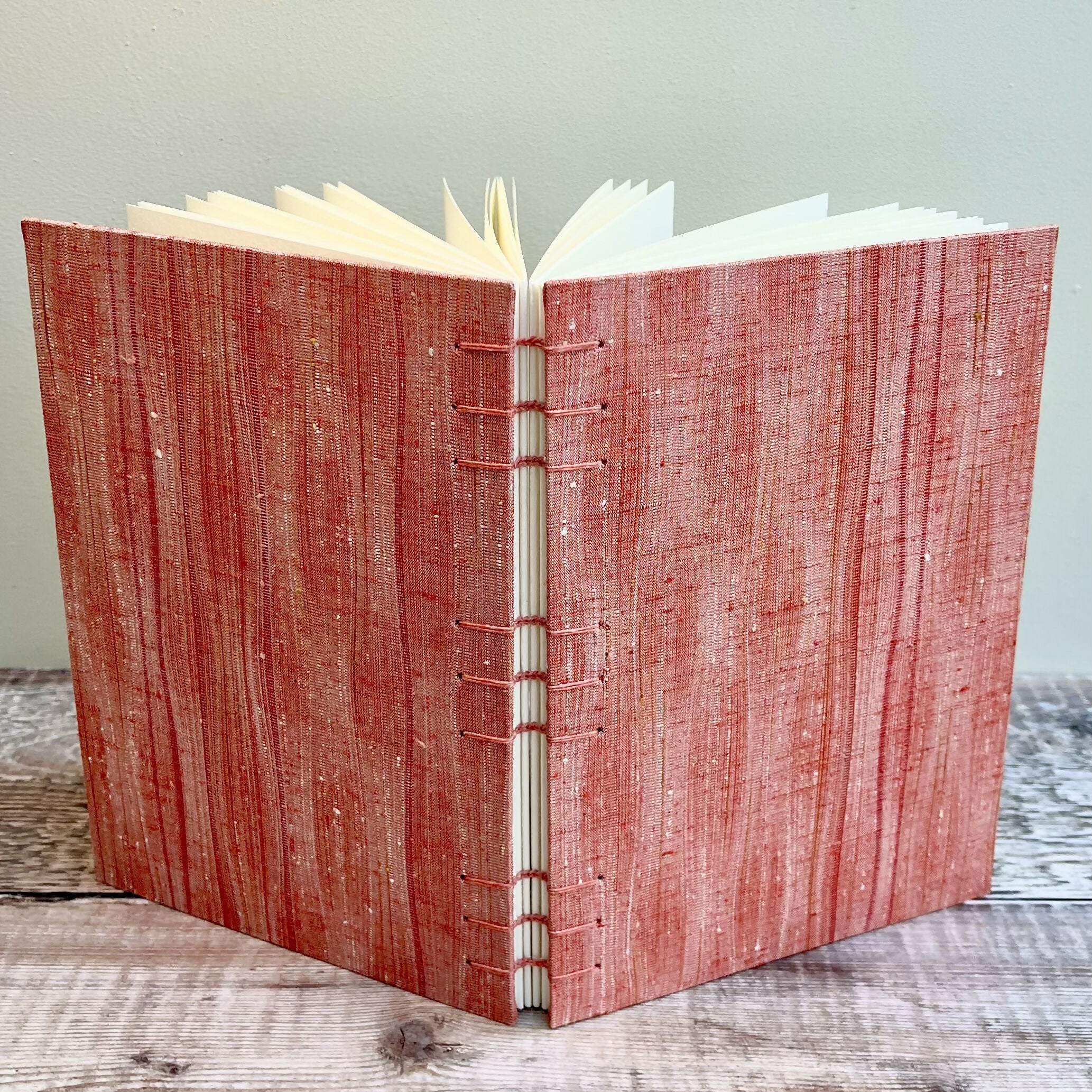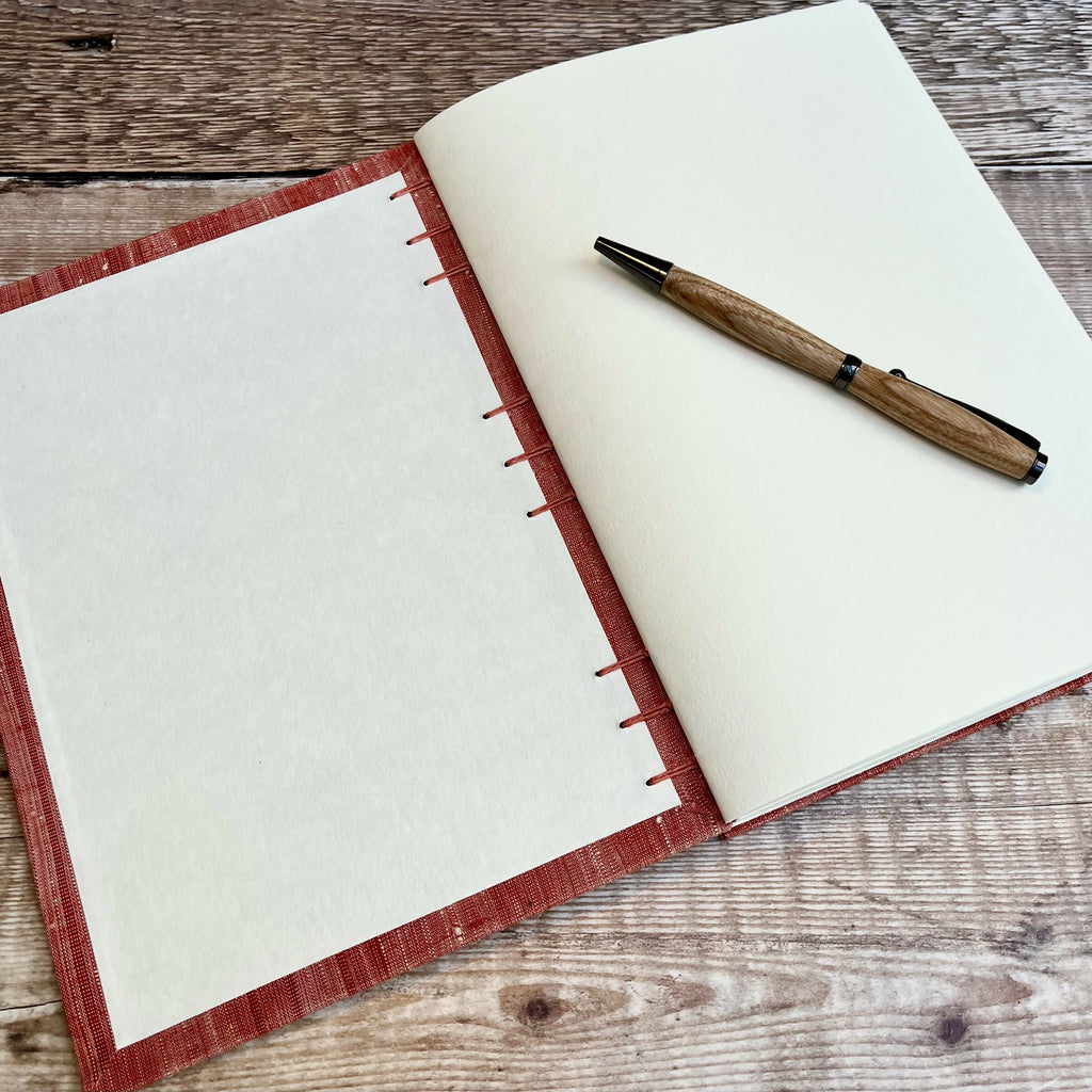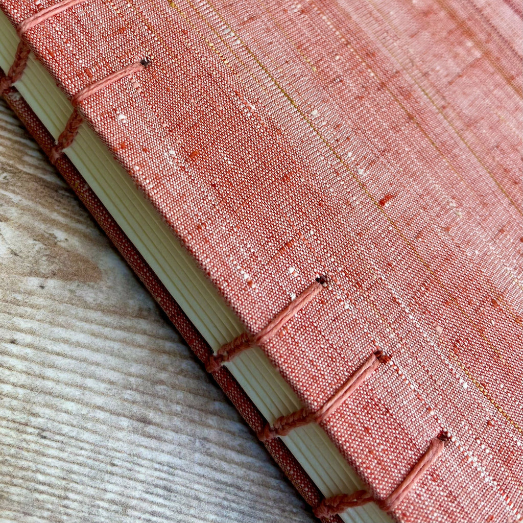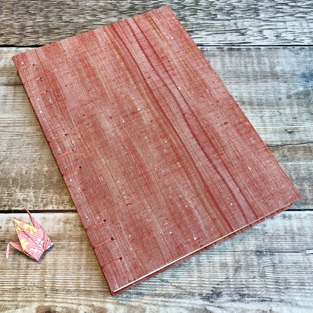 An A5 journal or sketchbook covered in a striking red upcycled kimono silk with Coptic Stitch binding.