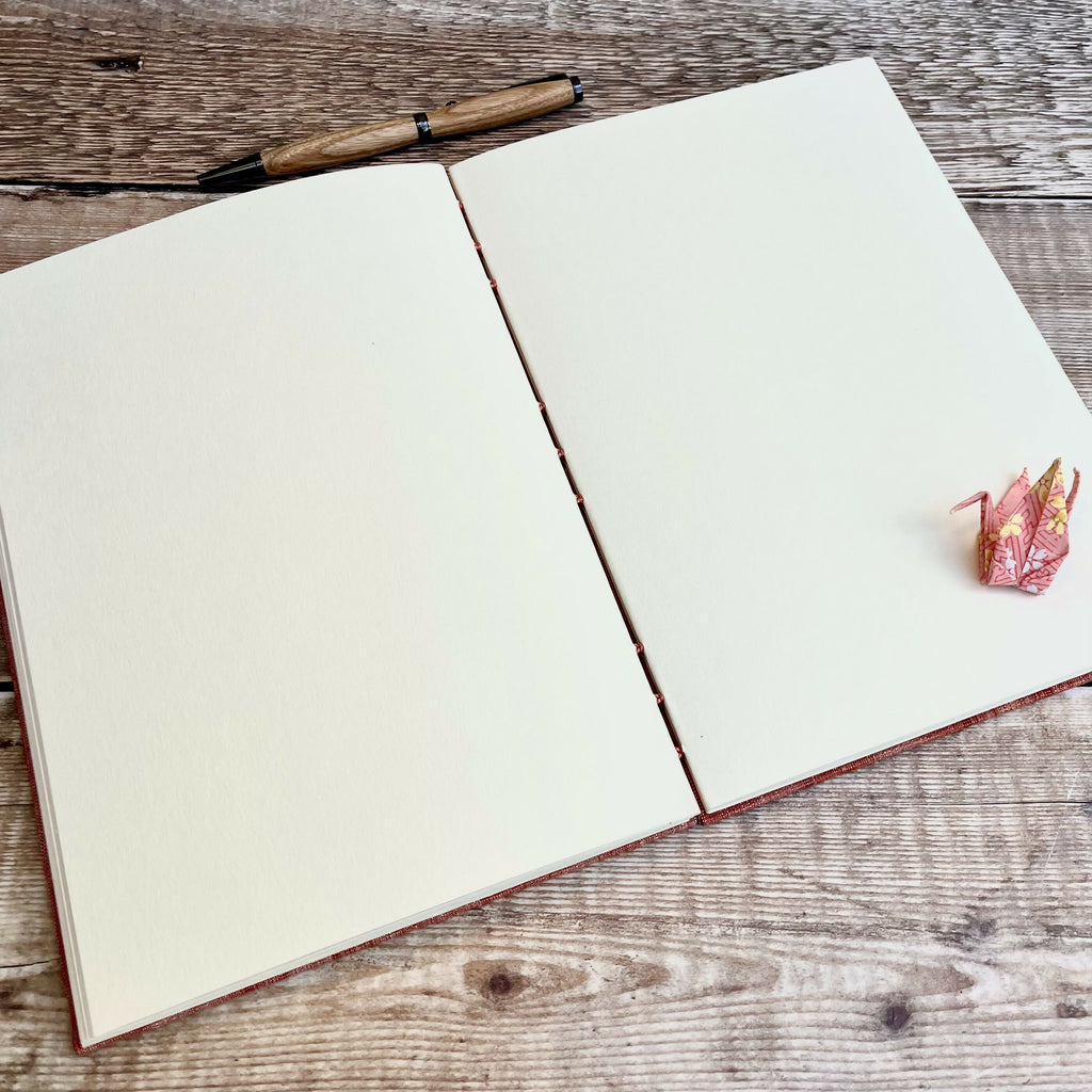 It has 56 pages (112 sides) of high quality, responsibly sourced 120gsm pale ivory paper, perfect for all writing and drawing mediums. The paper is folded into 7 sections which are then stitched together to create a beautiful exposed spine binding, allowing the book to lay completely flat when open.