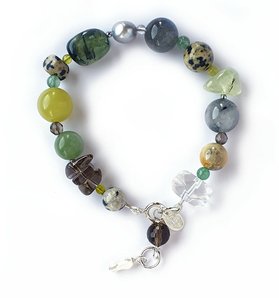 The stones include Smoky Quartz, Dalmatian Jasper, Aventurine, Prehnite, Agate, Serpentine, Rutile Quartz, Labradorite, Rock Crystal, freshwater Pearl and electroplated Hematite.