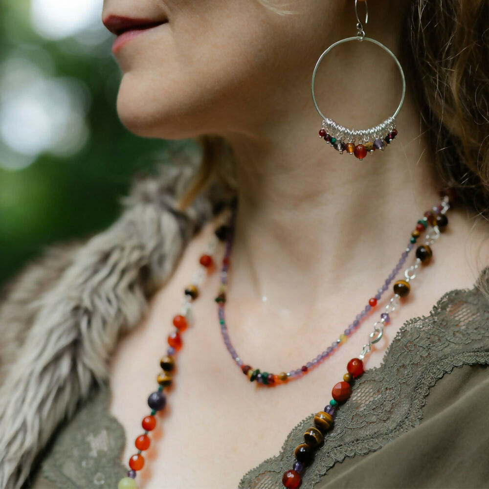 Crafted with Amethyst, Carnelian, Malachite, Serpentine, Tiger Eye, Garnet, and Hematite, each stone brings its own character and colour to the piece. Finished with a sterling silver clasp and a beaded extender chain for adjustable comfort.