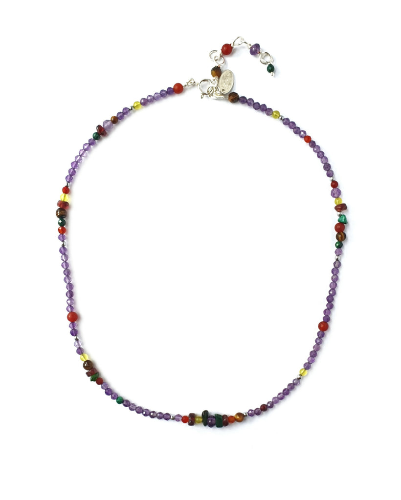 A delicate beaded necklace with an asymmetric twist, this short necklace features a mix of faceted Amethyst beads and natural gemstone fragments for a look that feels effortless yet distinctive.