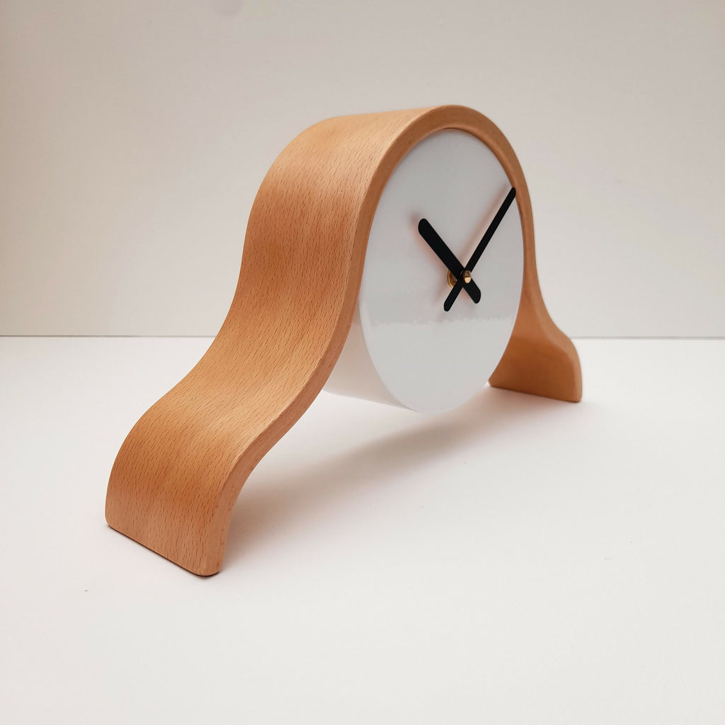 Each clock is crafted from steam-bent beech wood, shaped into a single, flowing curve that frames a white powder-coated drum. The warmth of the timber contrasts beautifully with the crisp white face and black hands, creating a design that feels both contemporary and timeless.