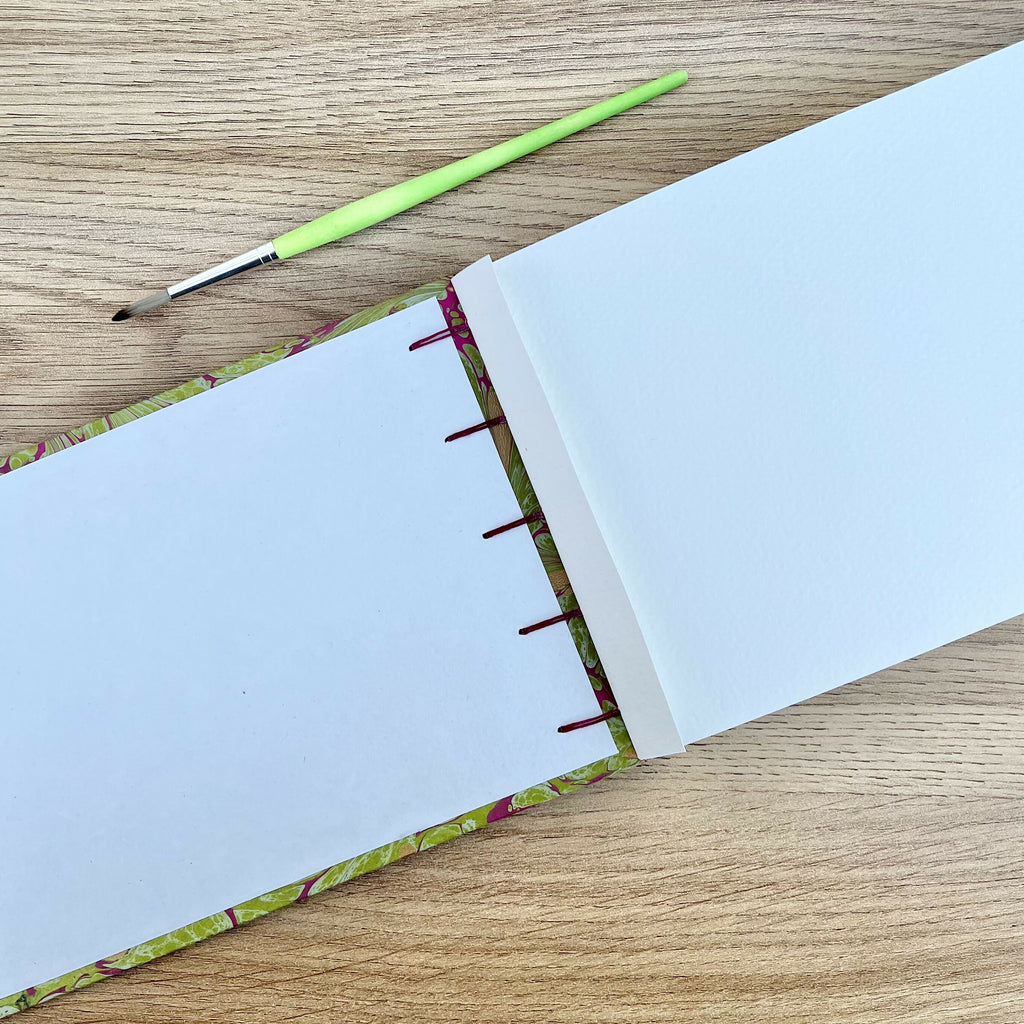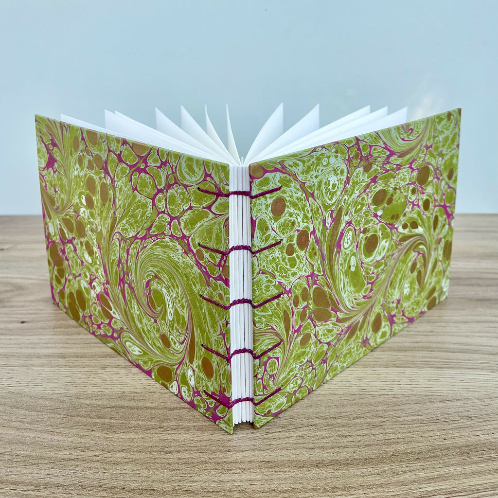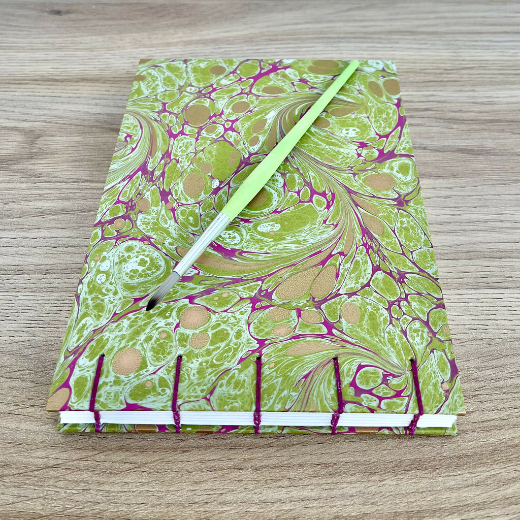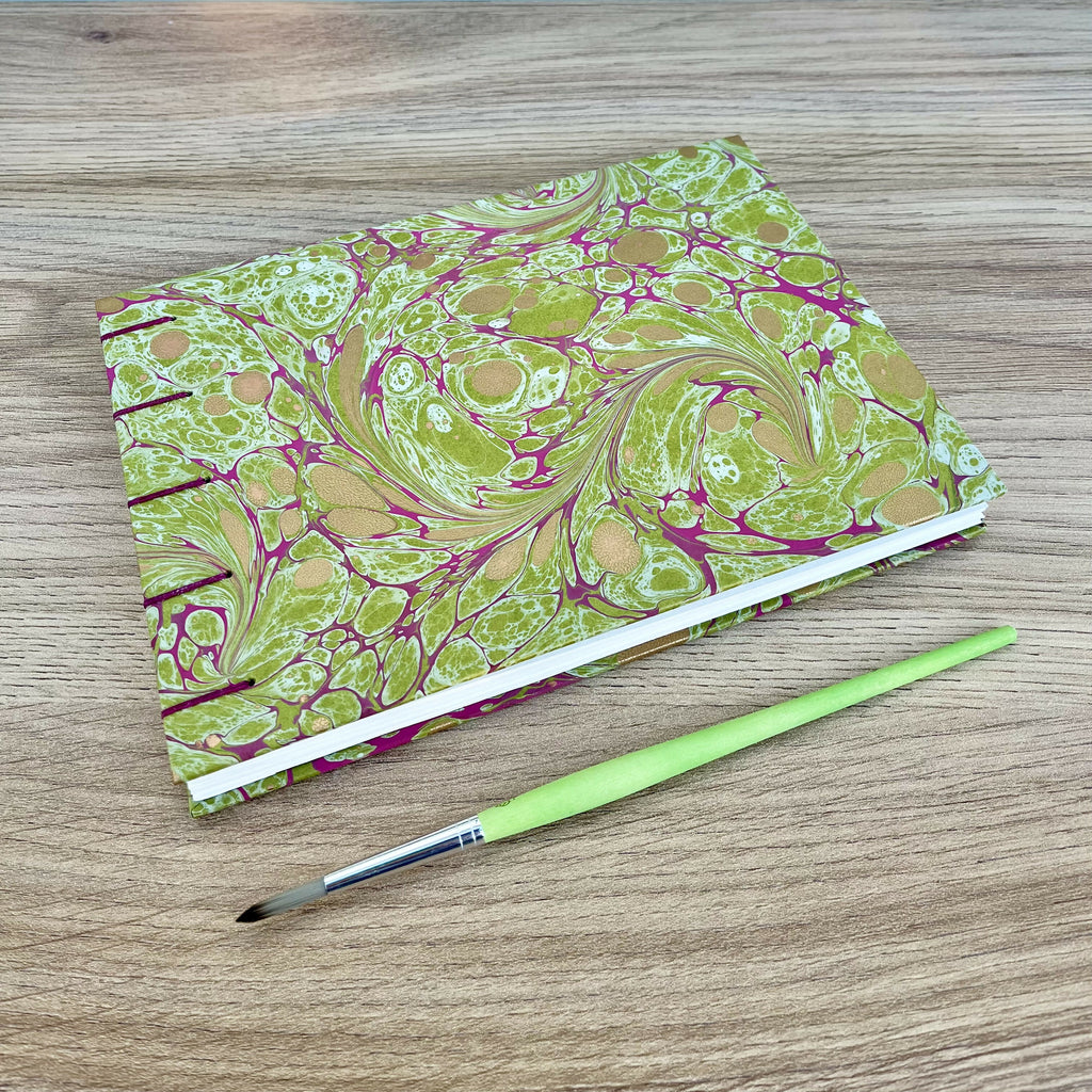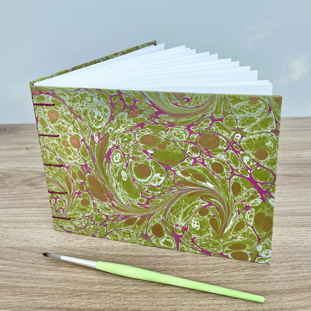 This handcrafted A5 watercolour sketchbook is bound in the Coptic stitch style and covered with a stunning green, magenta and gold hand marbled paper.