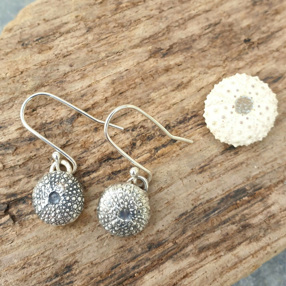 Made from a mould of a real little sea urchin these little dangly earrings are handmade with fine silver clay which is then torch fired and oxidised to bring out the textures. A perfect gift for anyone who loves the sea.