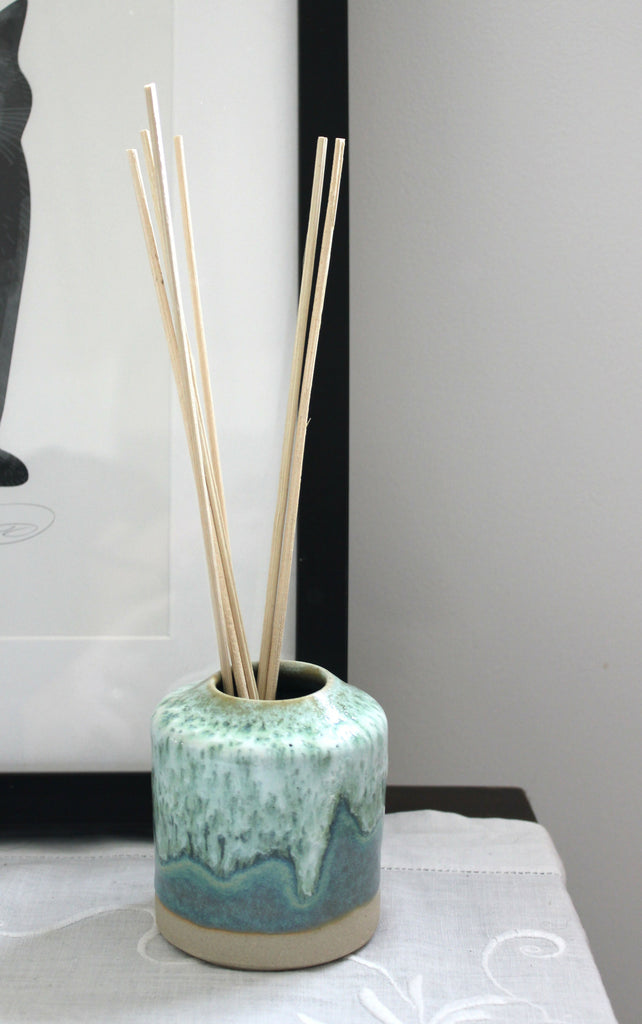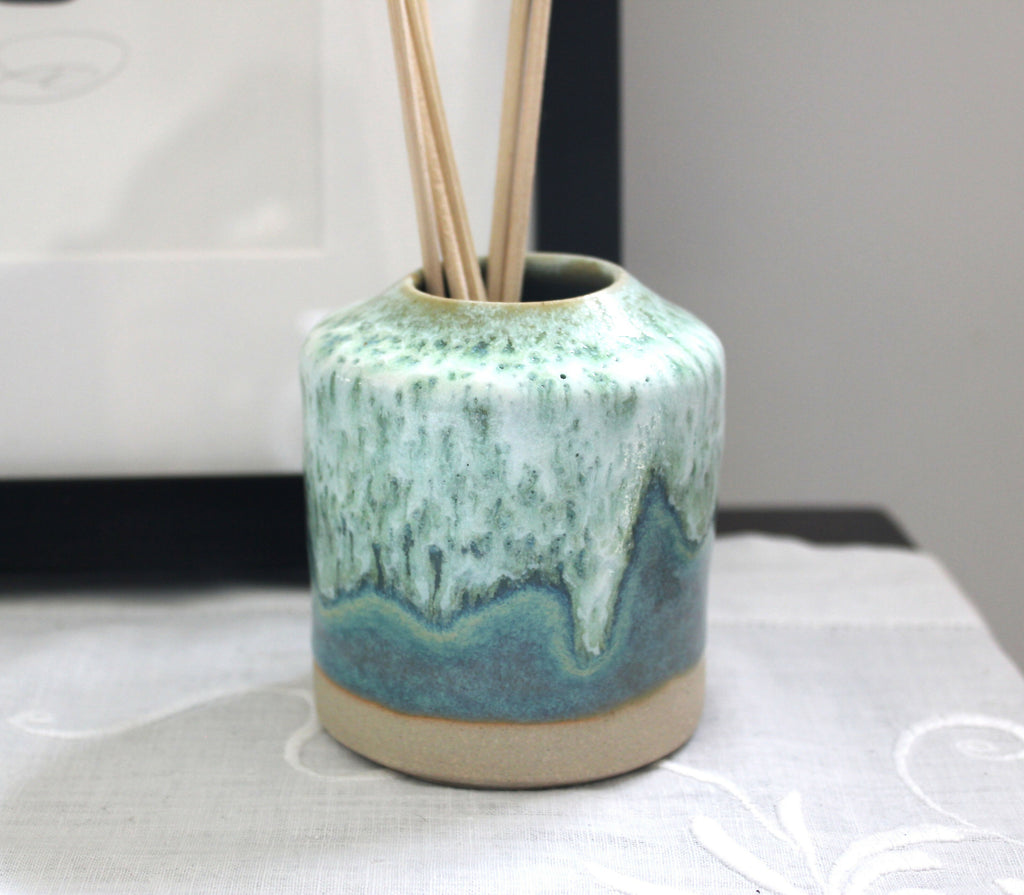 Delightful ceramic diffuser in a beautiful aqua and white colour. Fully glazed inside so it is suitable for use with fragrance oils or as a flower vase.
