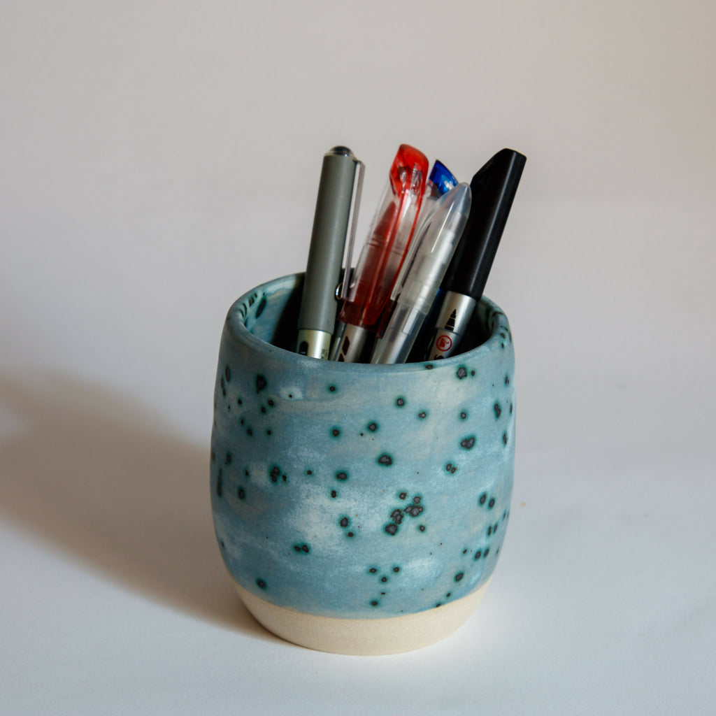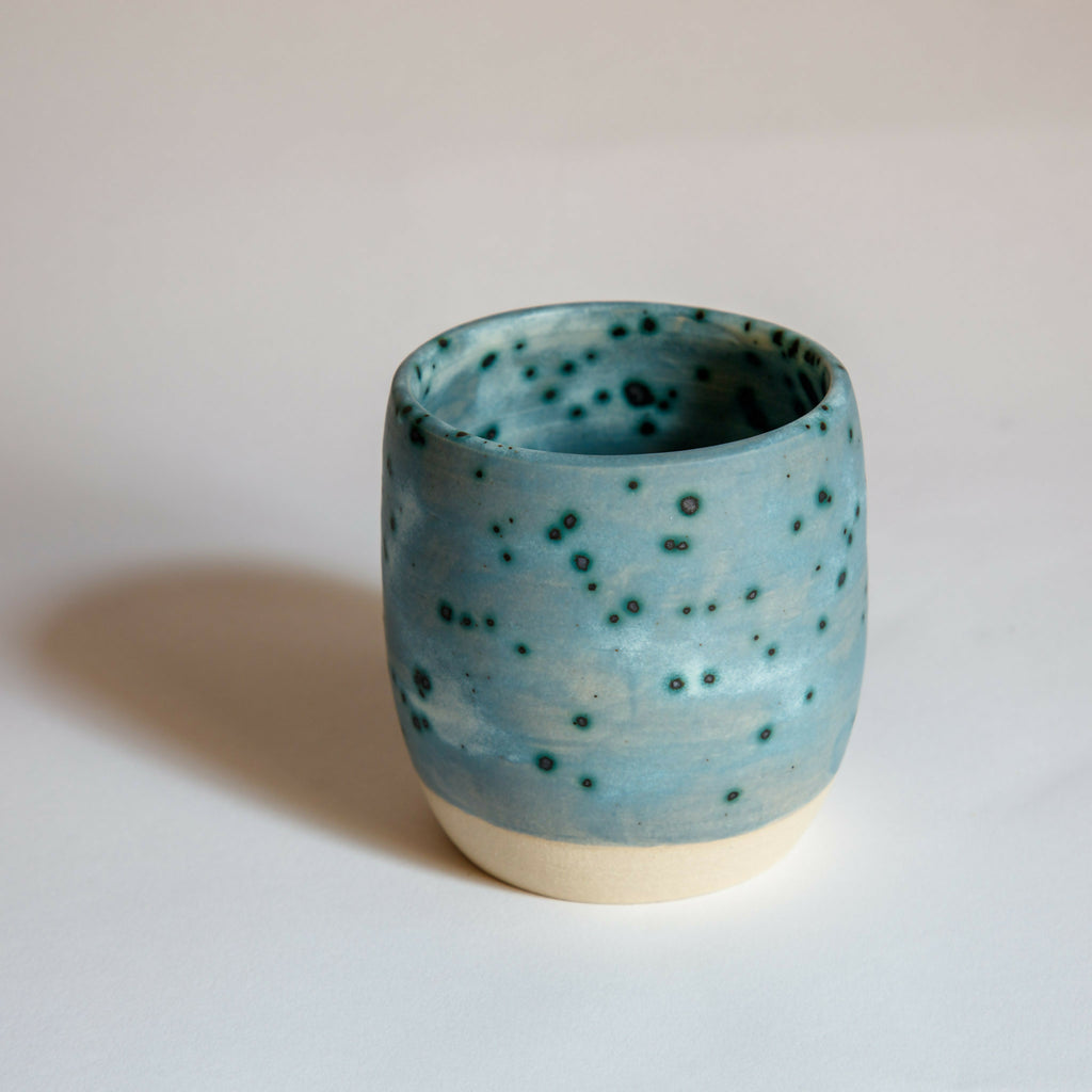 Beaker, budvase, pen pot - Ceramic in matt blue grey, metallic spots with blue halo