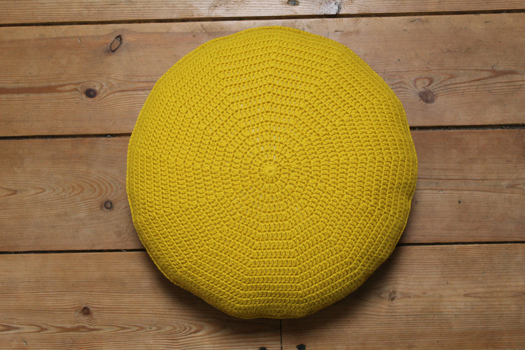 Hand Crocheted Golden Yellow Round Lambswool Cushion