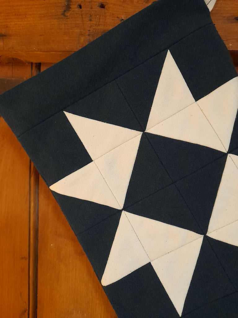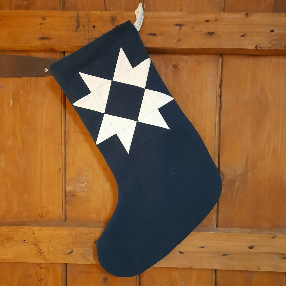A Christmas stocking with a patchwork star design on the front and a plain back.