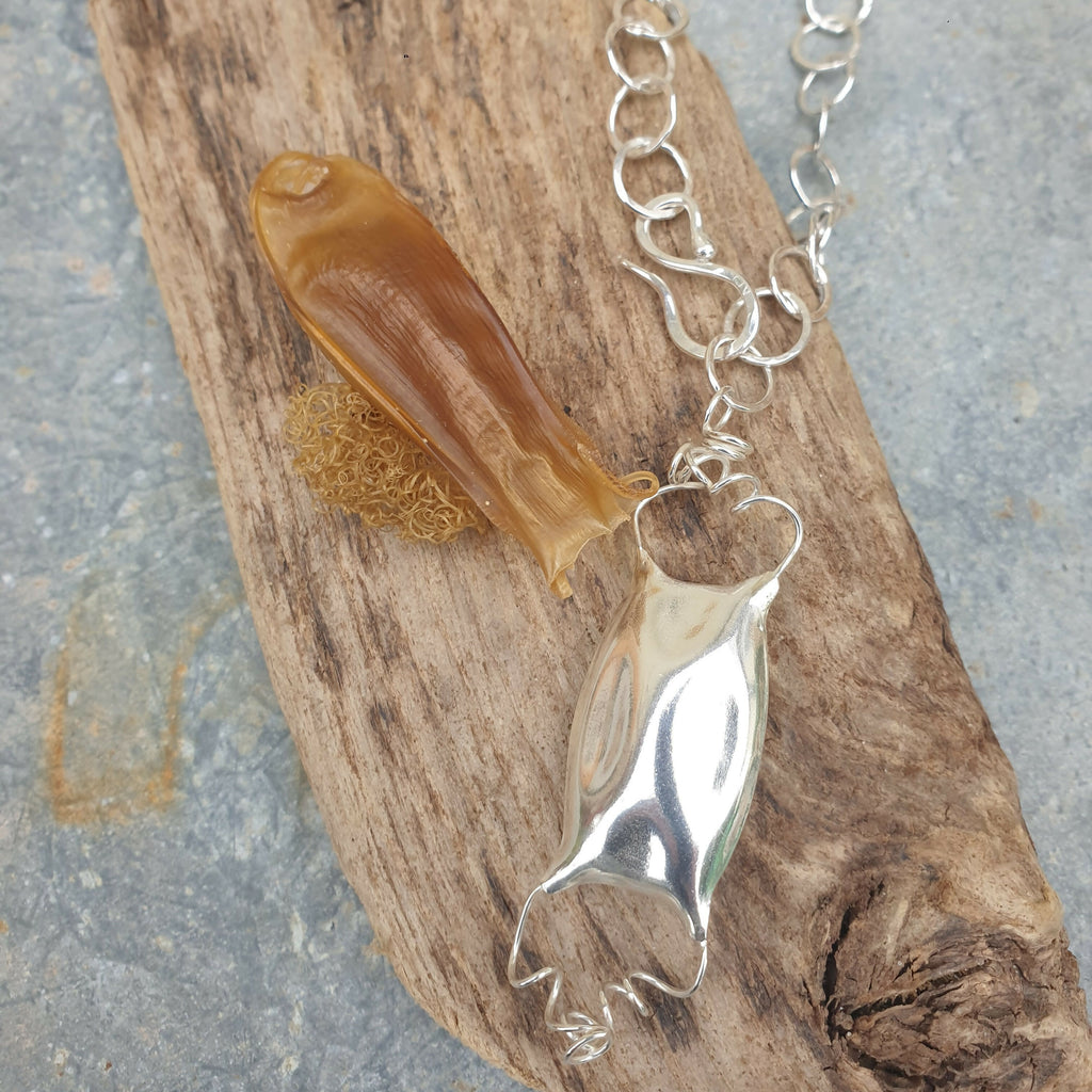 This pendant has been made from 0.5mm fine silver which has been given a light texture with sterling silver tendrils added and formed into a loop for the chain.