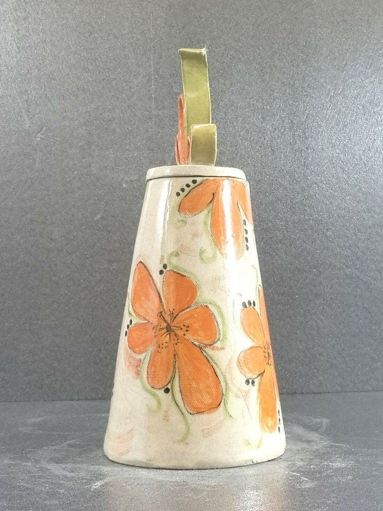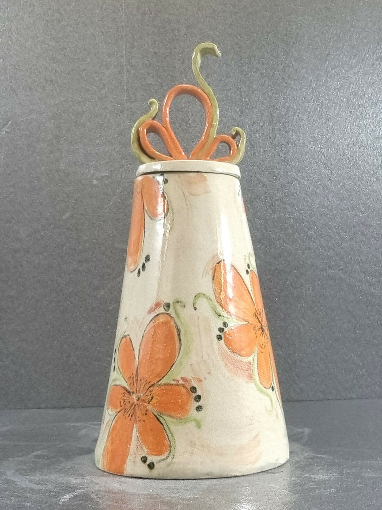 Stoneware glazed lidded jar with hand-painted design by Kathleen Hepworth