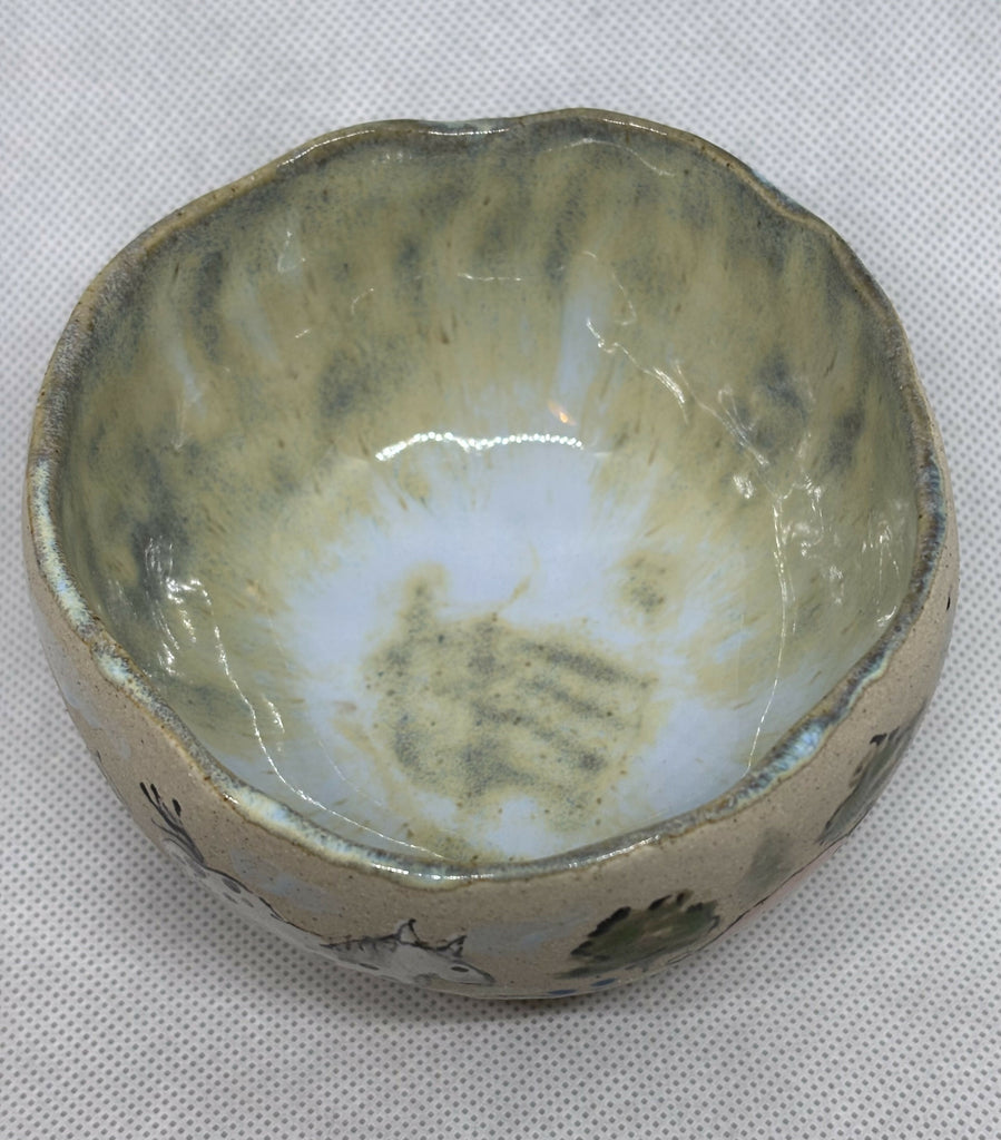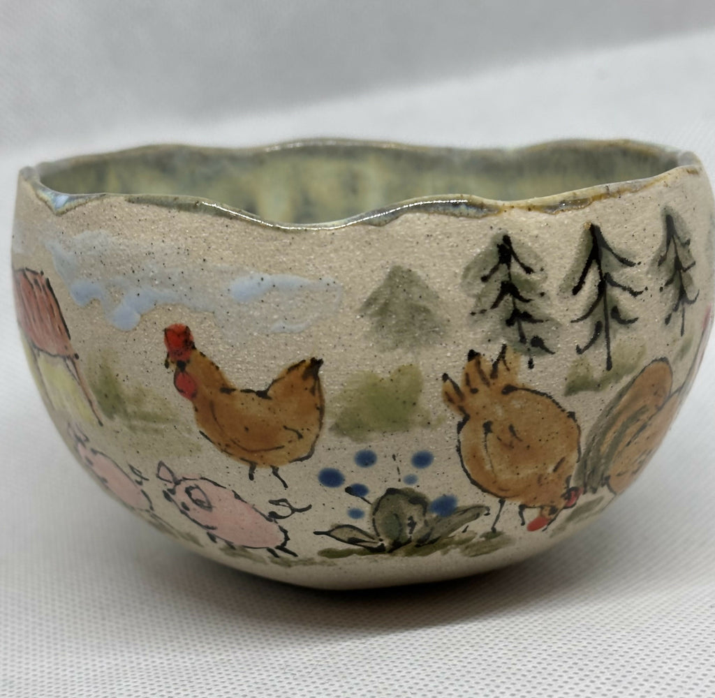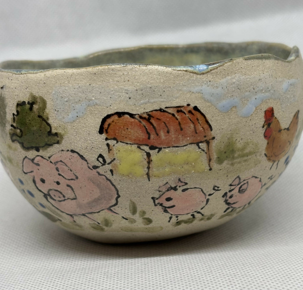 A unique hand painted and handmade small bowl glazed with illustrations of chickens, cow, horse and pigs - you know you need a slightly wobbly but very friendly bowl! The inside is glazed in a soft blue. Made in Devon.